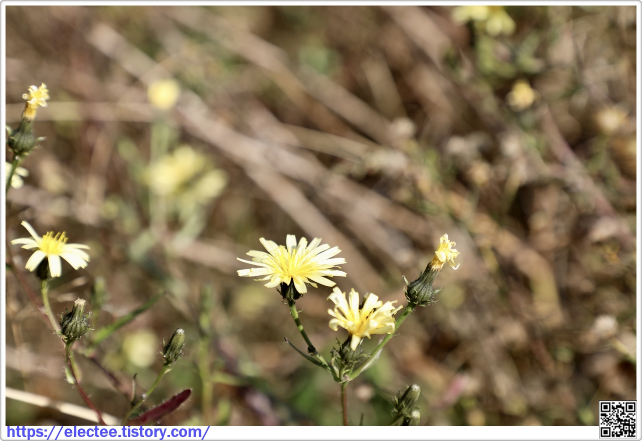 잡초가 우거진 치에서 자란 쇠서나물 꽃은 벌써 색이 빠져 연노랑으로 변했다.