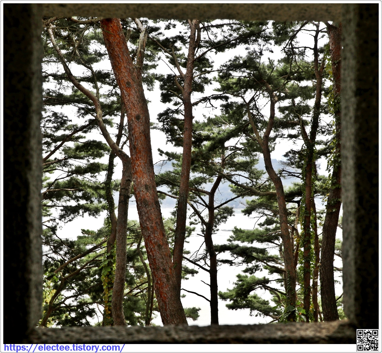 포자 안에서 대포가 나가는 작은 구멍을 통해 본 바닷가 풍경은 소나무가 가리고 있다.