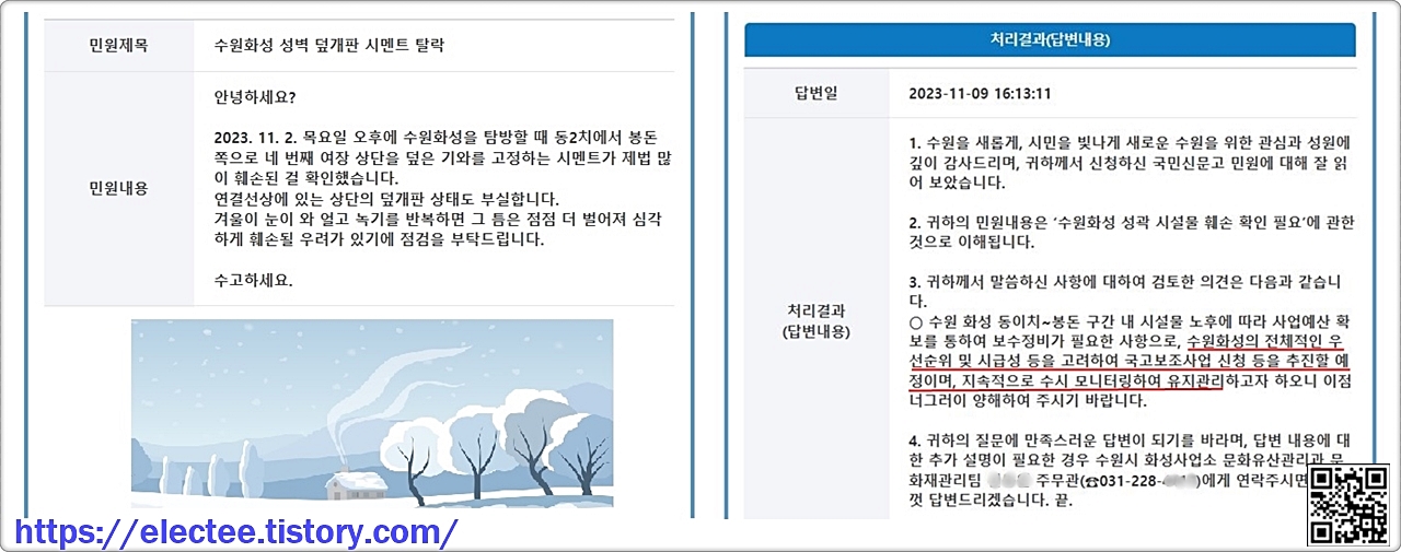 뭐든 처음에 보수하면 적은 예산으로 가능하기에 바로 수원시청에 민원을 넣었다.