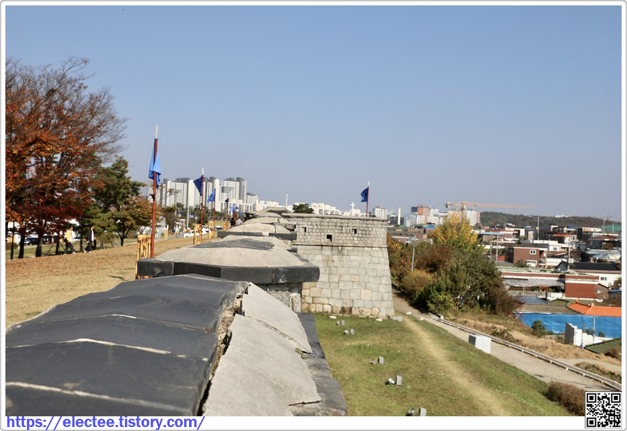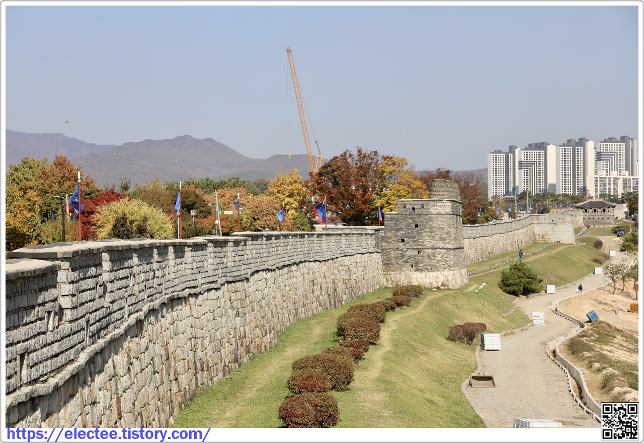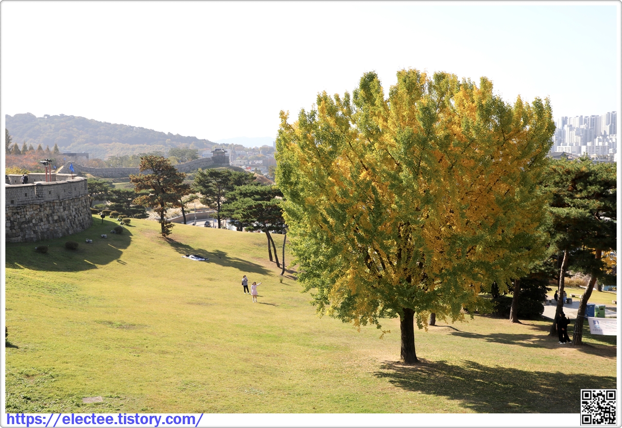 푸른 잔디와 단풍이 아름답게 어울리는 수원화성이다.
