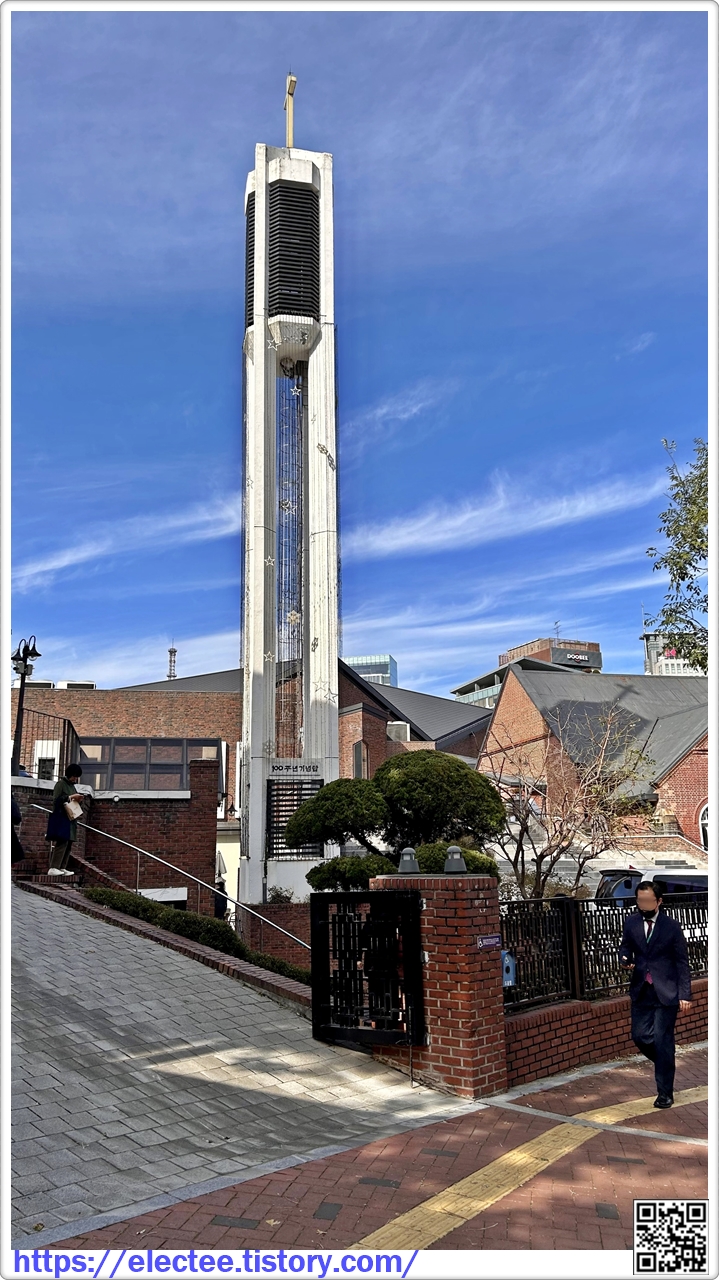 정동제일교회 100주년 기념탑이 하늘을 찌를 만큼 높다.