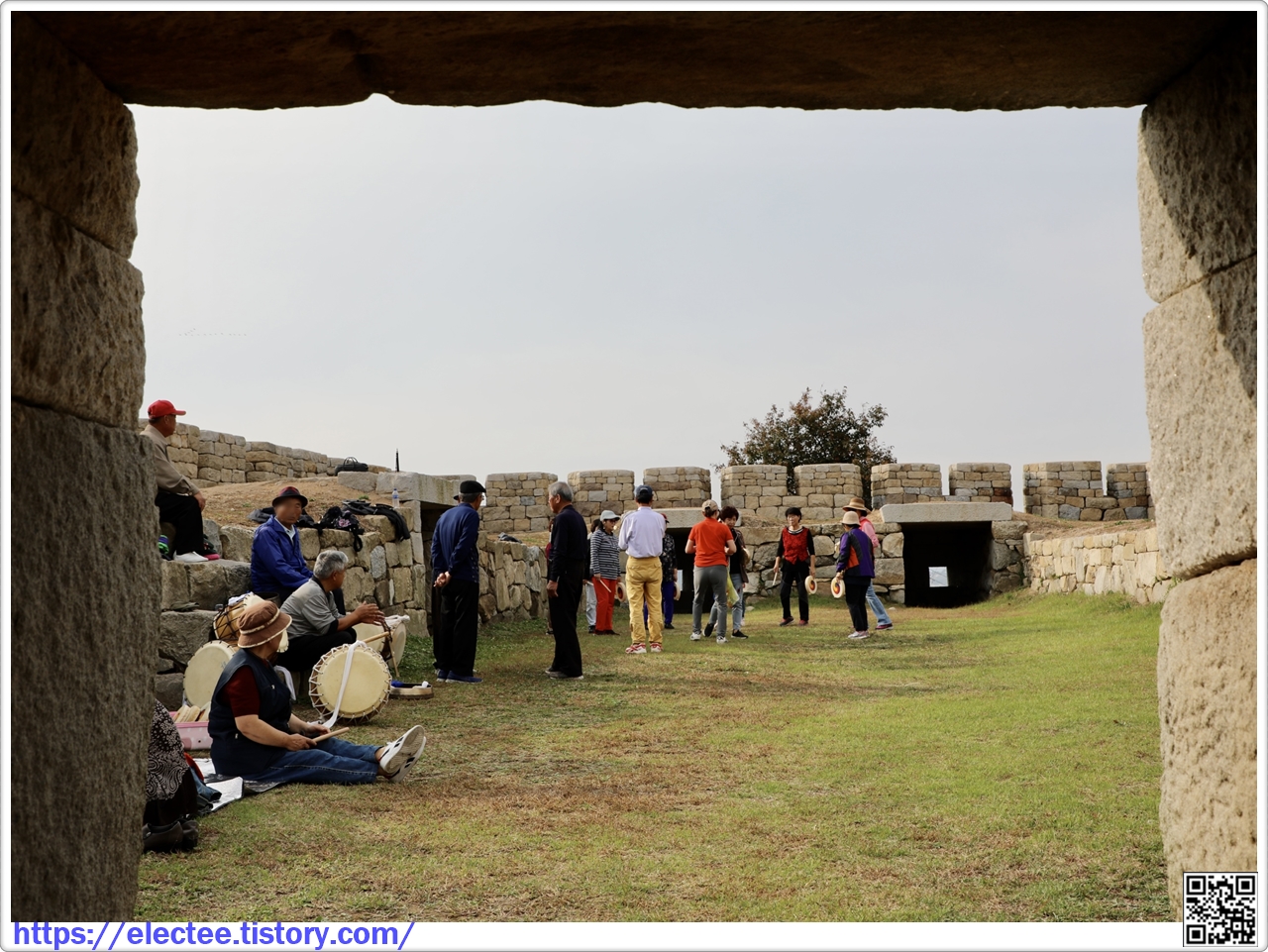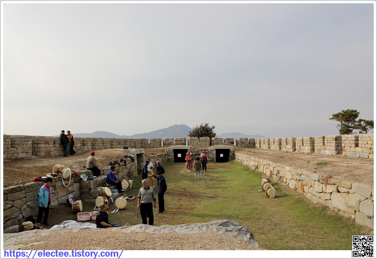 돈대 입구로 들어서니 한쪽에선 막 농악놀이 연습을 하고 있고, 왼쪽에서 남정네들이 앉아 계신다.