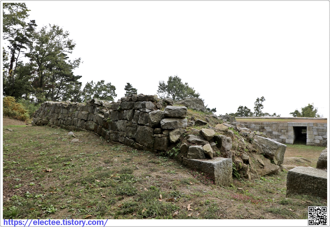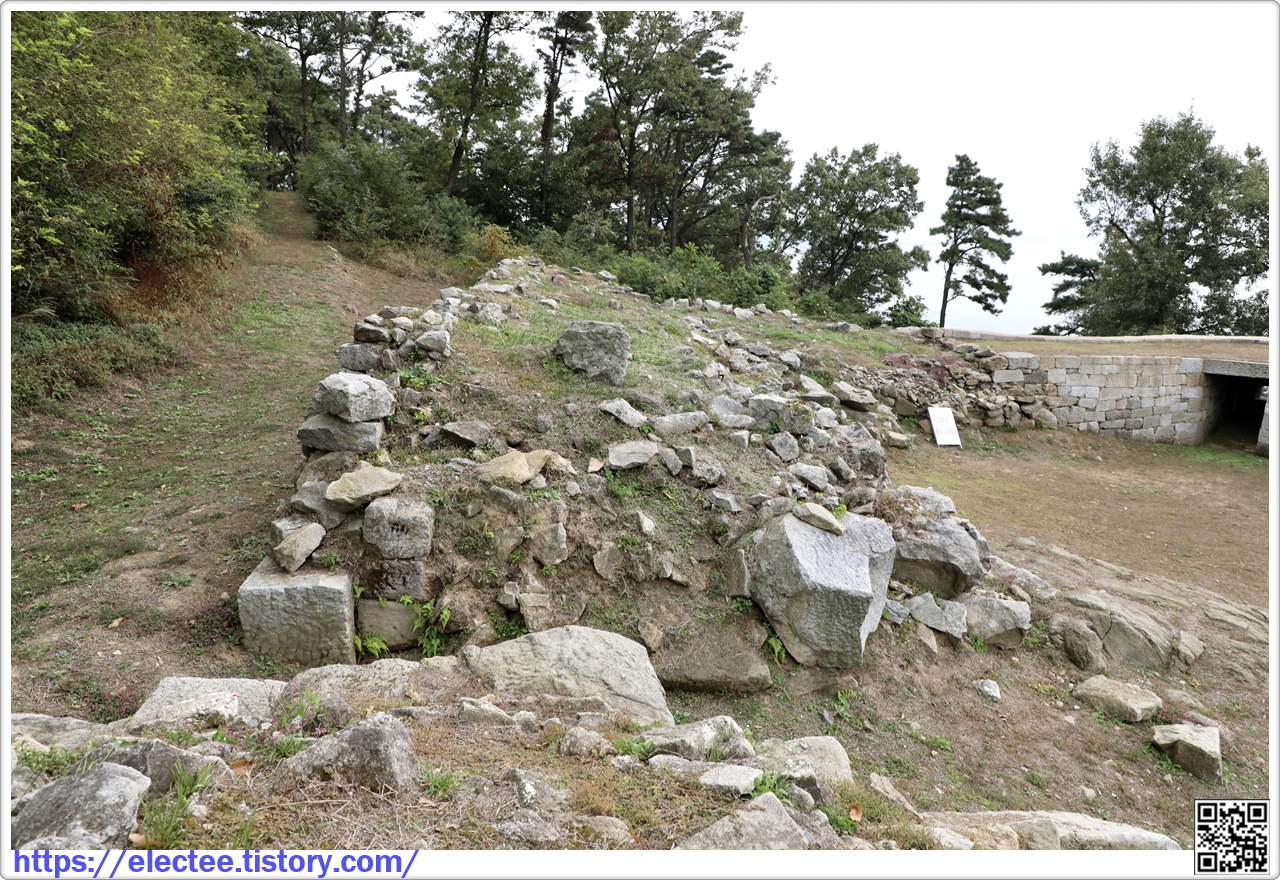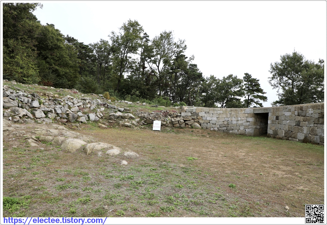 Jeongpobo Fort. It has four artillery emplacements, and its stone walls form a rectangle, measuring 36 m