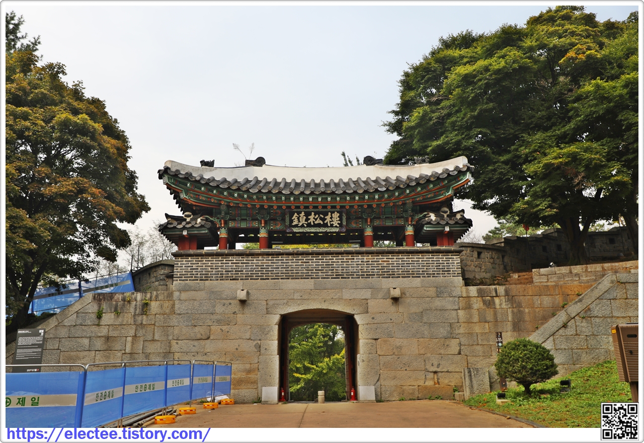 북문인 진송루 주변은 성벽공사로 어수선하다.