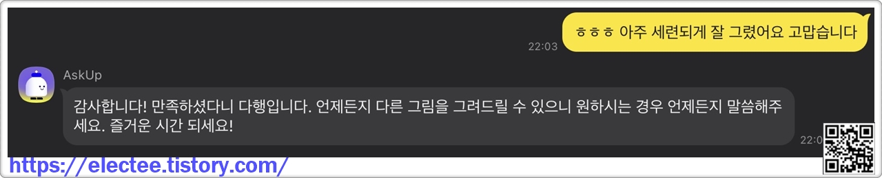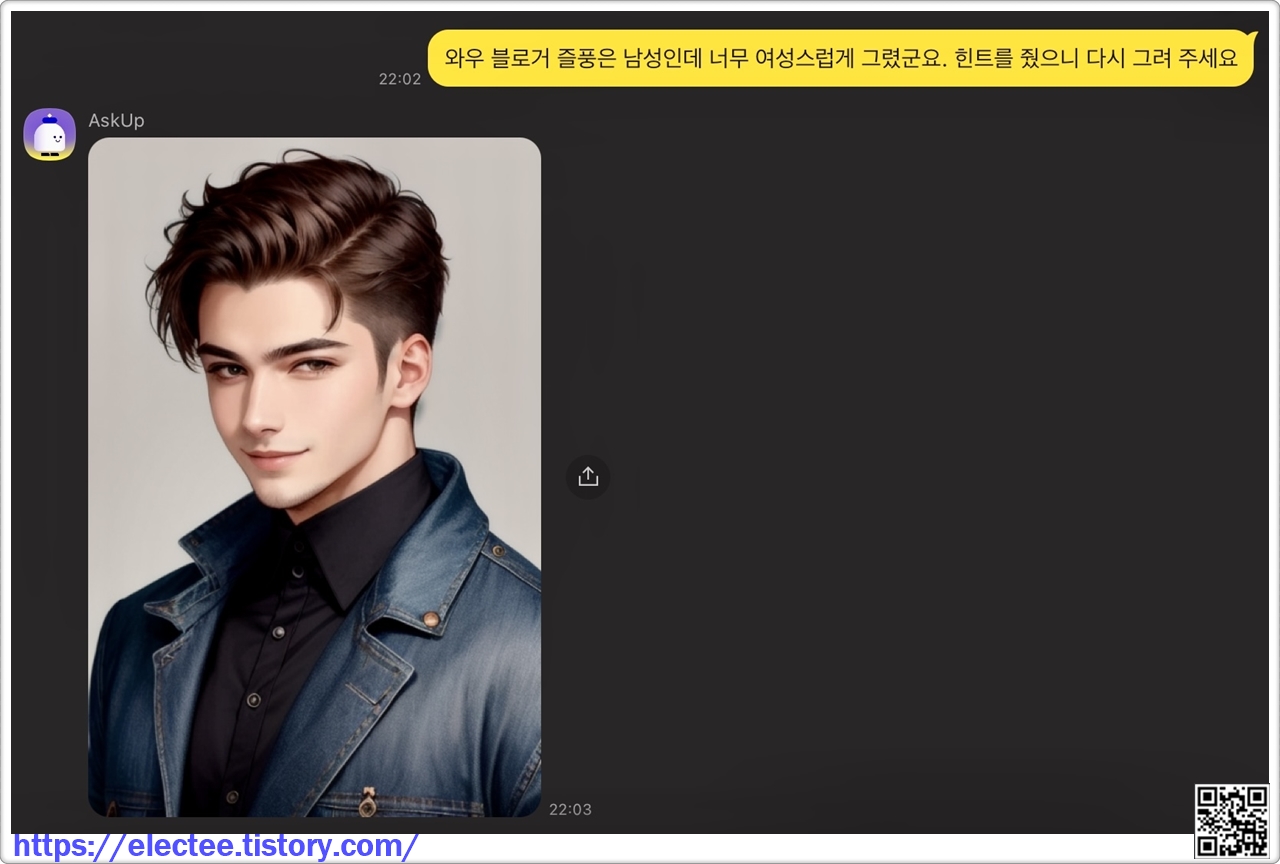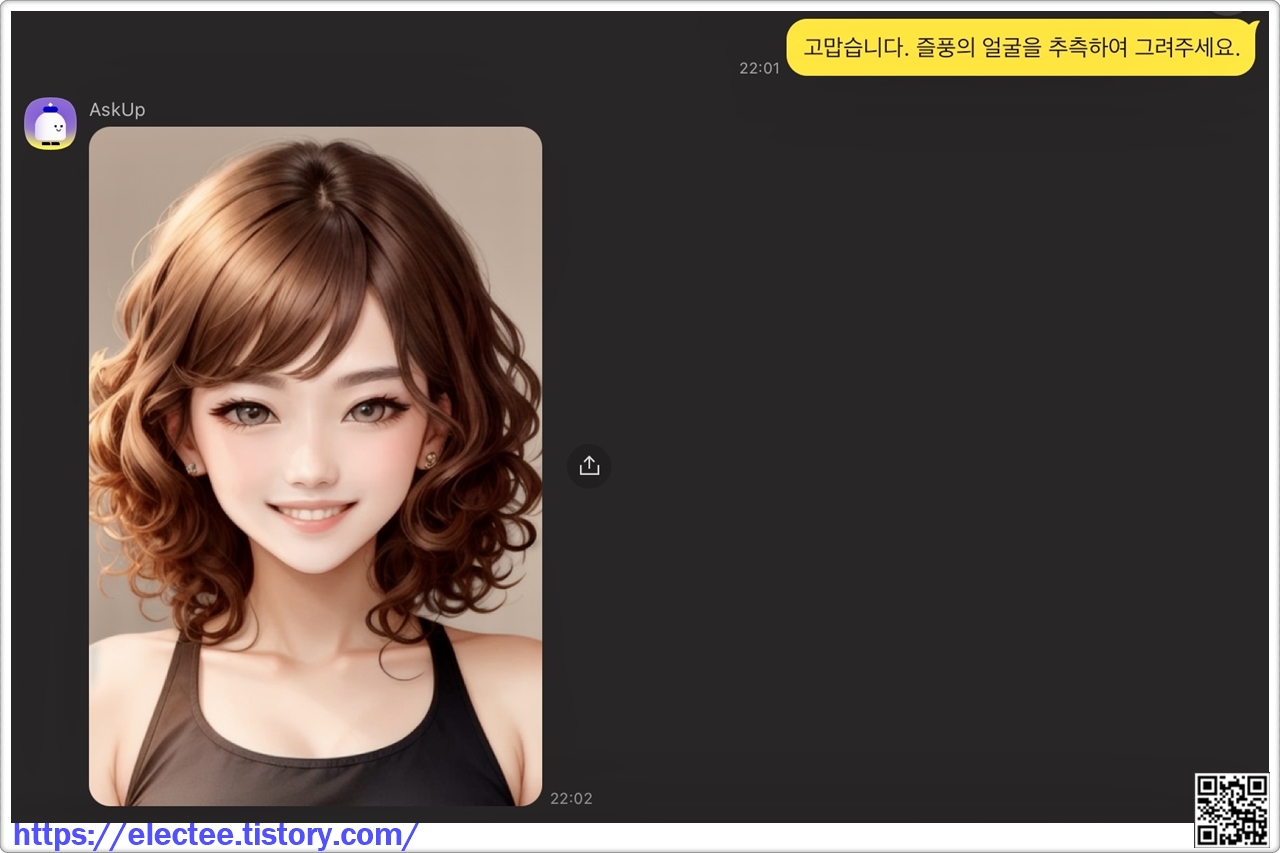 AskUp과 대화를 이어가던 중 "선택된 산행과 여행"의 티스토리 제작자인 「즐풍」의 이미지를 그려달라고 했다.