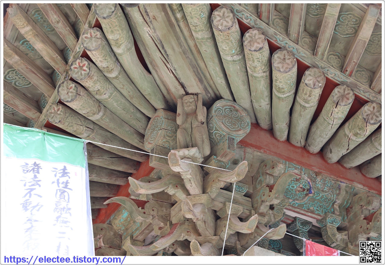 얻어 새로운 사람으로 다시 태어나라는 의미로 추녀 밑에 새겨 추녀를 받치게 하였다고 한다. 천장은 용, 극락조,