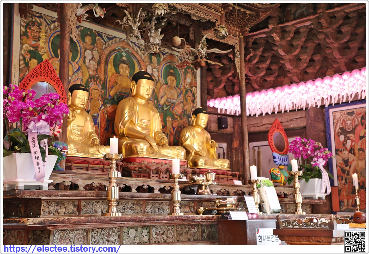 대웅보전은 절의 중심 건물로, 석가모니불과 아미타불, 약사여래불을 모신 곳이다.