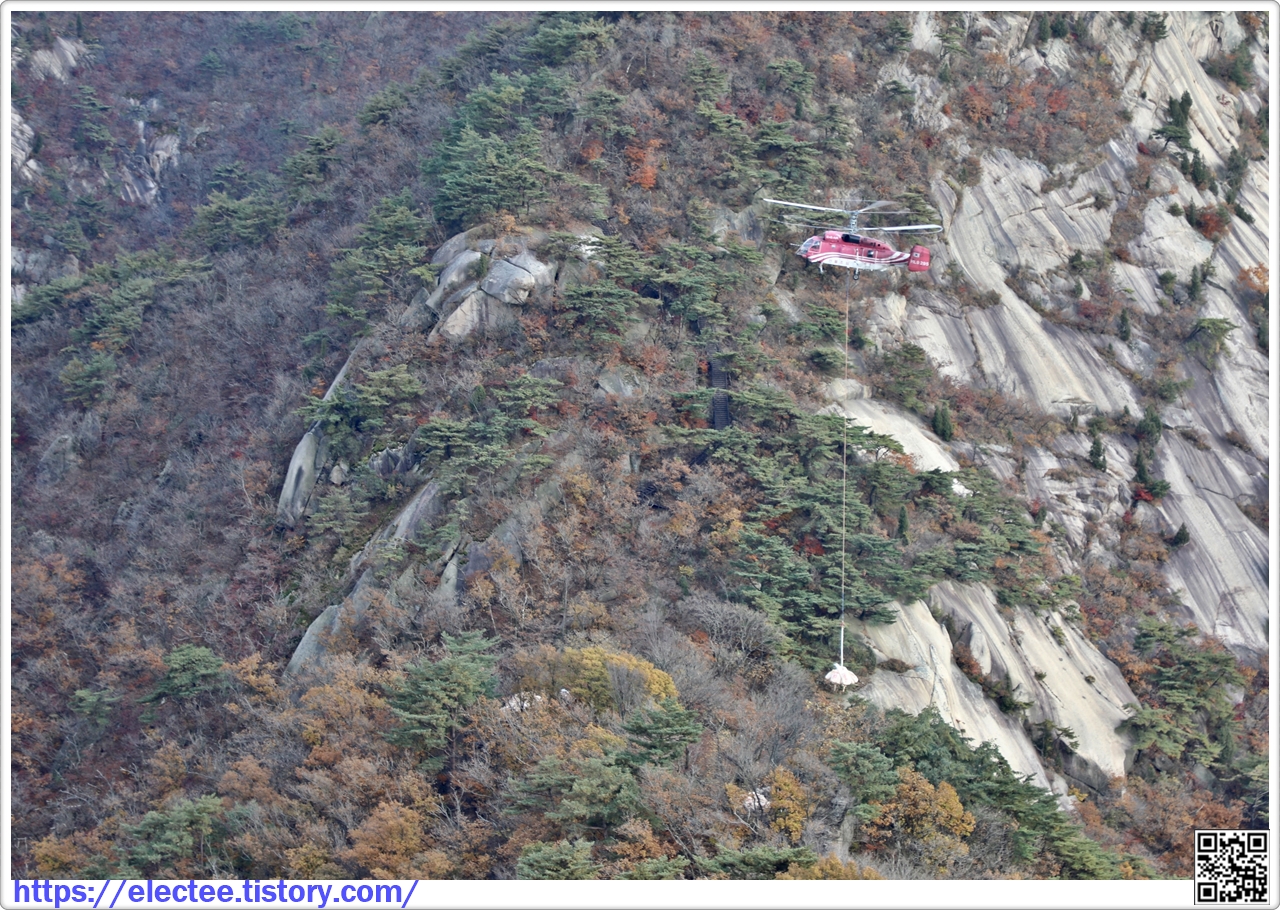 북한산성을 내려오는 데 헬기가 오후 내내 여장을 복원할 돌을 나른다.