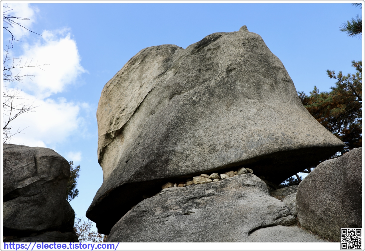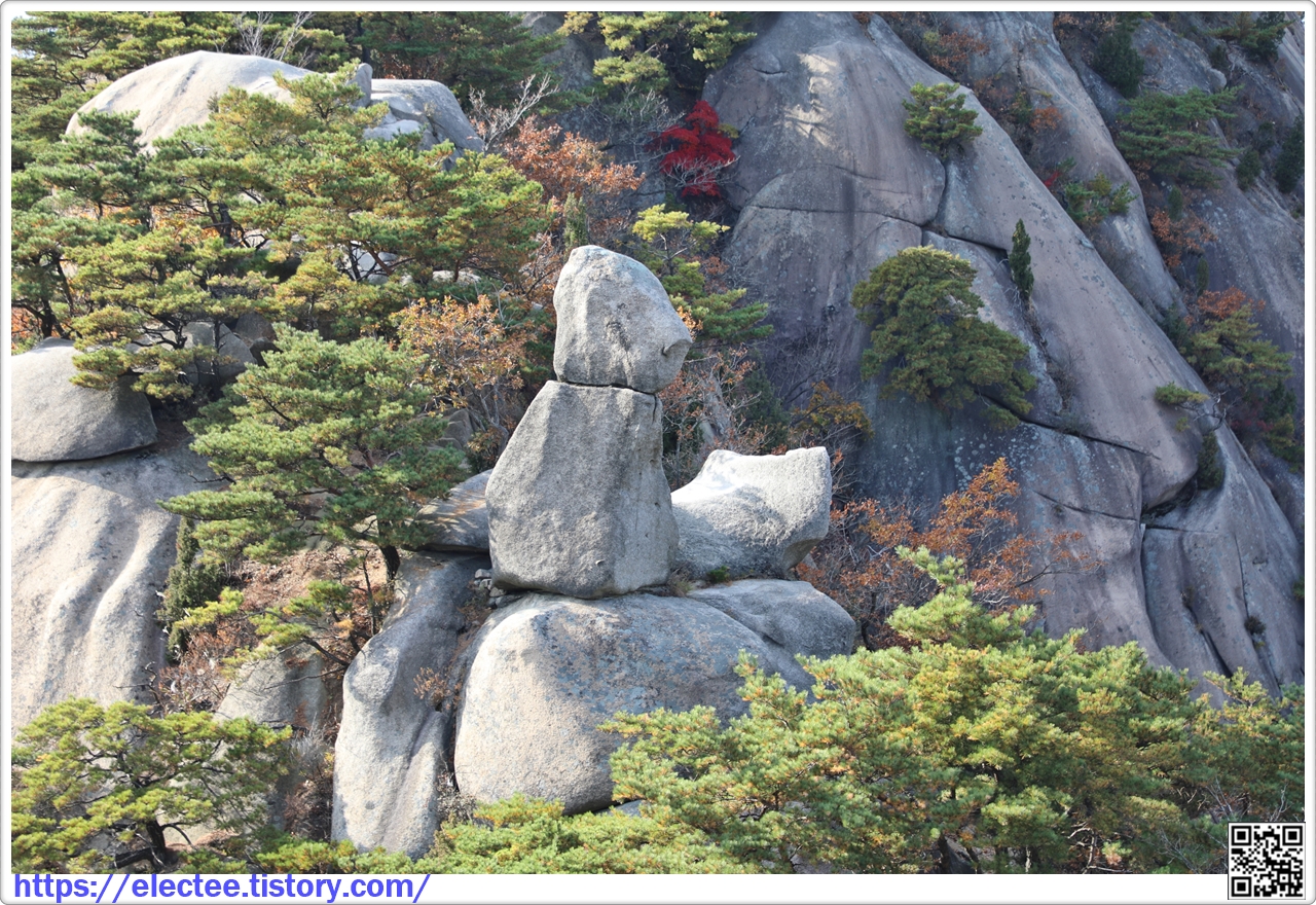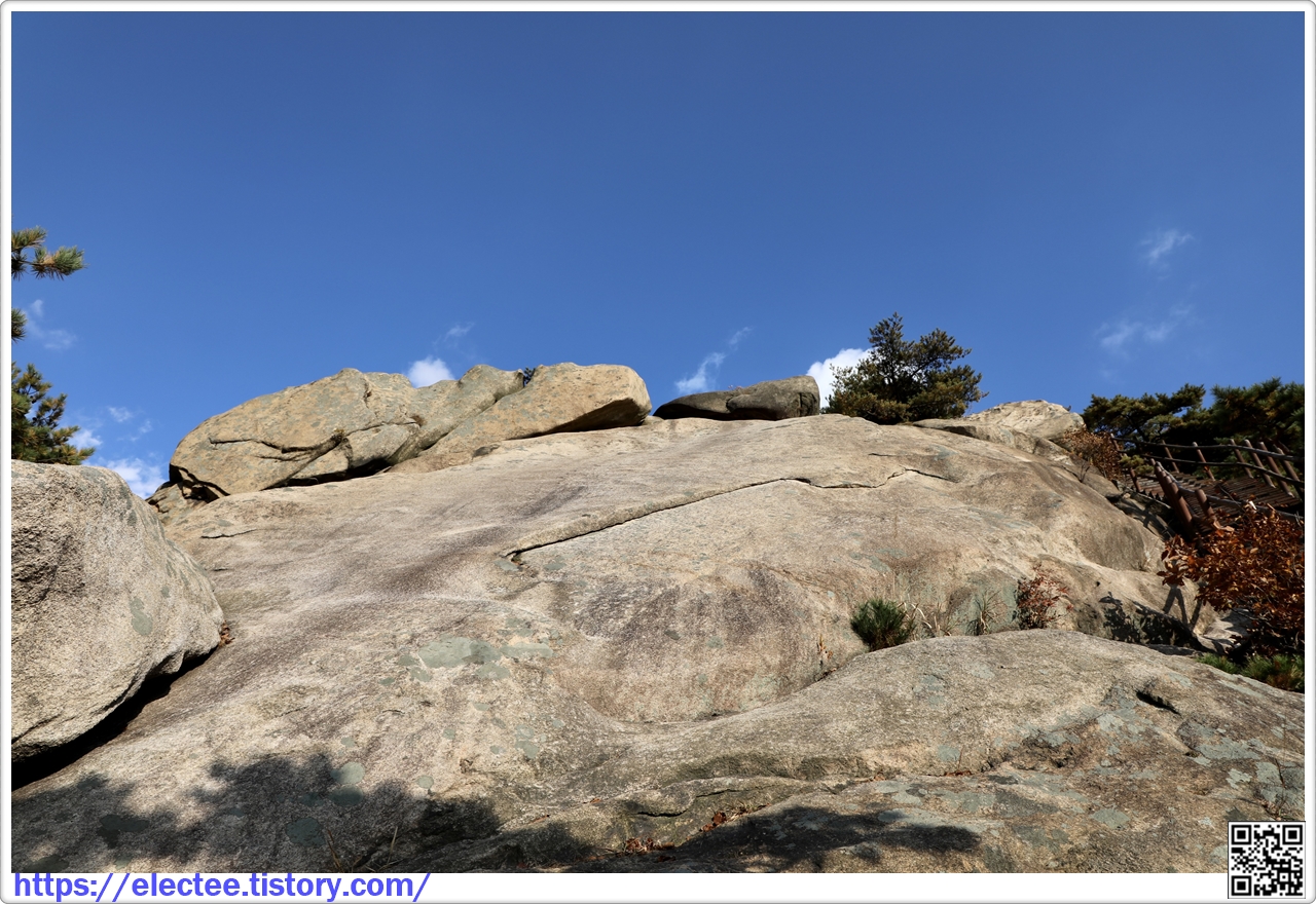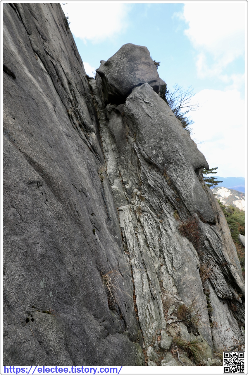 이 바위는 사진으로 보면 평탄해 보이지만, 실제 올라가려면 경사가 심해 오르기 어렵다.