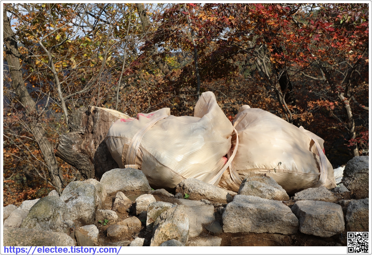 현장 직원에게 물어보니 한 자루에 대략 700~1,000kg의 돌이 들어 있다고 하니 약 5톤 정도를 실어 나르는 셈이다.