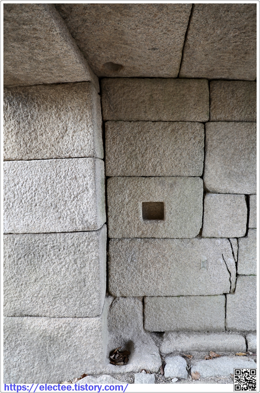 올리고, 그 위 천장 부분은 장대석 여러 매를 걸쳐 만들었다. 이런 양식의 성문을 아치 모양의 홍예식과 구분하여