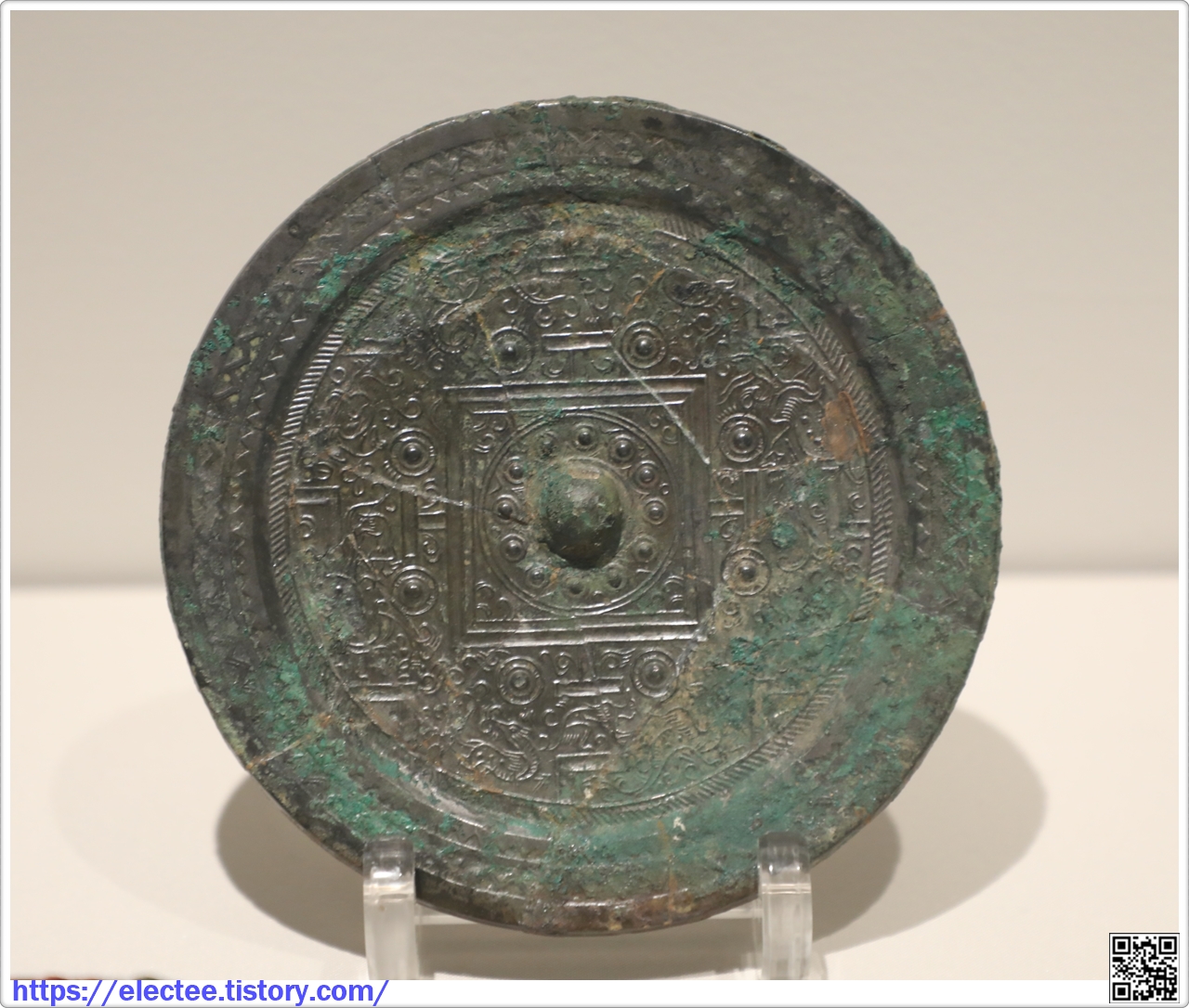 중국 중원지역과 관련된 청동 거울이다. 가운데에 위치한 네모꼴 무늬를 중심으로 주위에 'T•L•V' 무늬가 있으며 동서남북으로 사신과 신수 무늬를 세밀하게 배치했다.