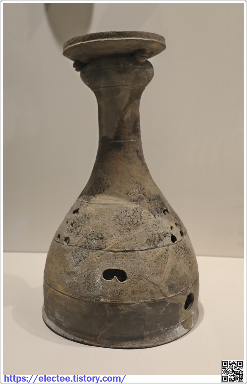 굽다리에 가야의 특징이라 할 수 있는 상하 일렬의 사각형 구멍이 뚫려 있는 굽다리 접시이다. 단추 모양의 꼭지가 달린 뚜껑이 얹혀 있어 한 세트를 이룬다. 김해 지역 금관가야의 왕의 무덤으로 추정되는 대성동 1호 무덤에서 출토된 토기로, 5세기대 가야 지배층의 세련된 토기 문화를 보여 준다.