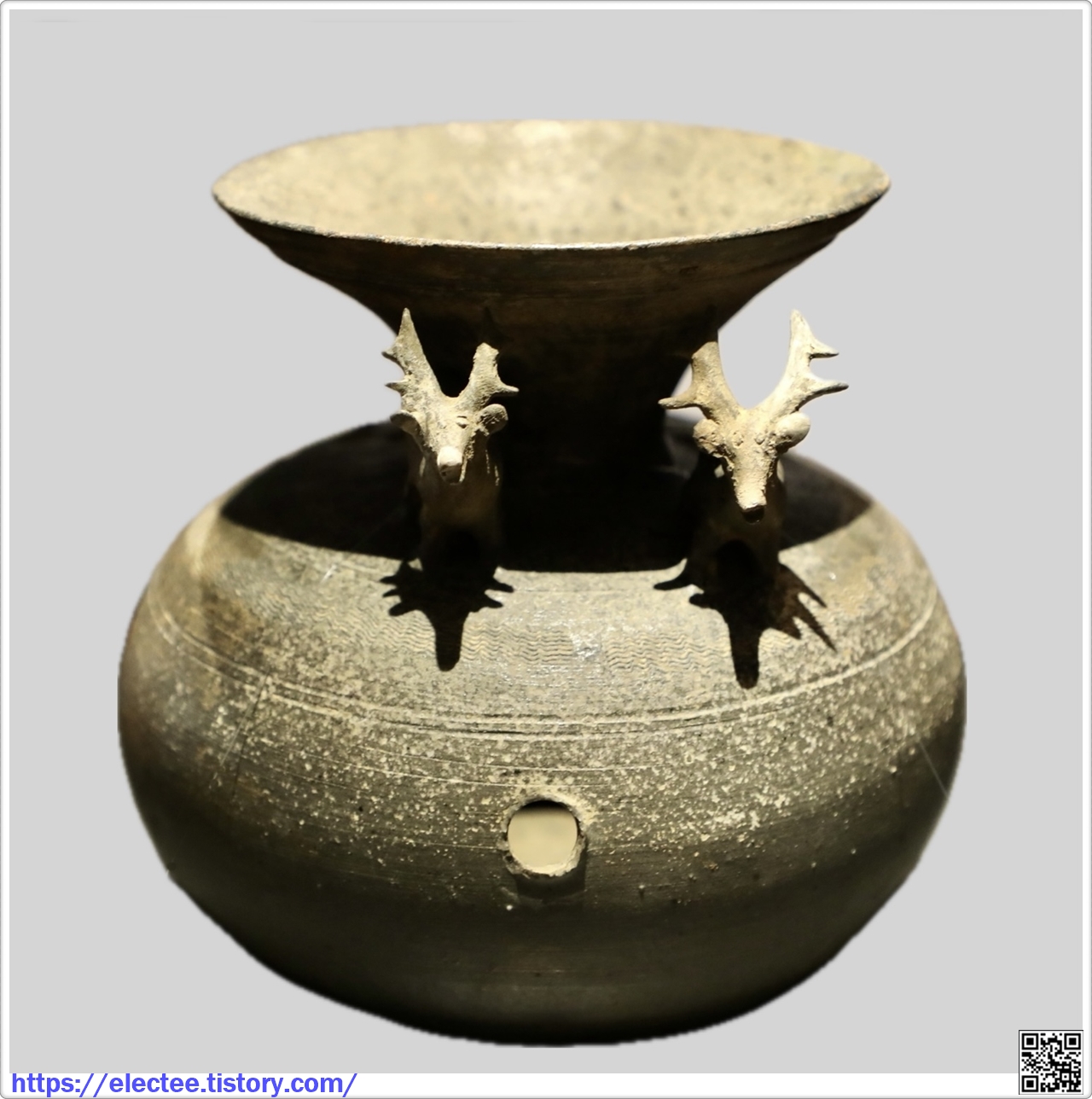 단지의 아가리 아래쪽에 사슴 두 마리가 나란히 장식되어 있다. 몸체는 밑이 둥근 공 모양이며 중앙 한쪽에 구멍이 뚫려 있다. 몸체 위에는 넓게 벌어진 깔때기 모양의 아가리가 붙어 있다. 사슴의 뿔은 다소 과장되게 표현되어 있다. 사슴은 고대 북방 아시아의 여러 민족이 신성시한 동물로, 이를 숭배하고 신앙의 대상으로 삼았던 가야 문화를 엿볼 수 있다.