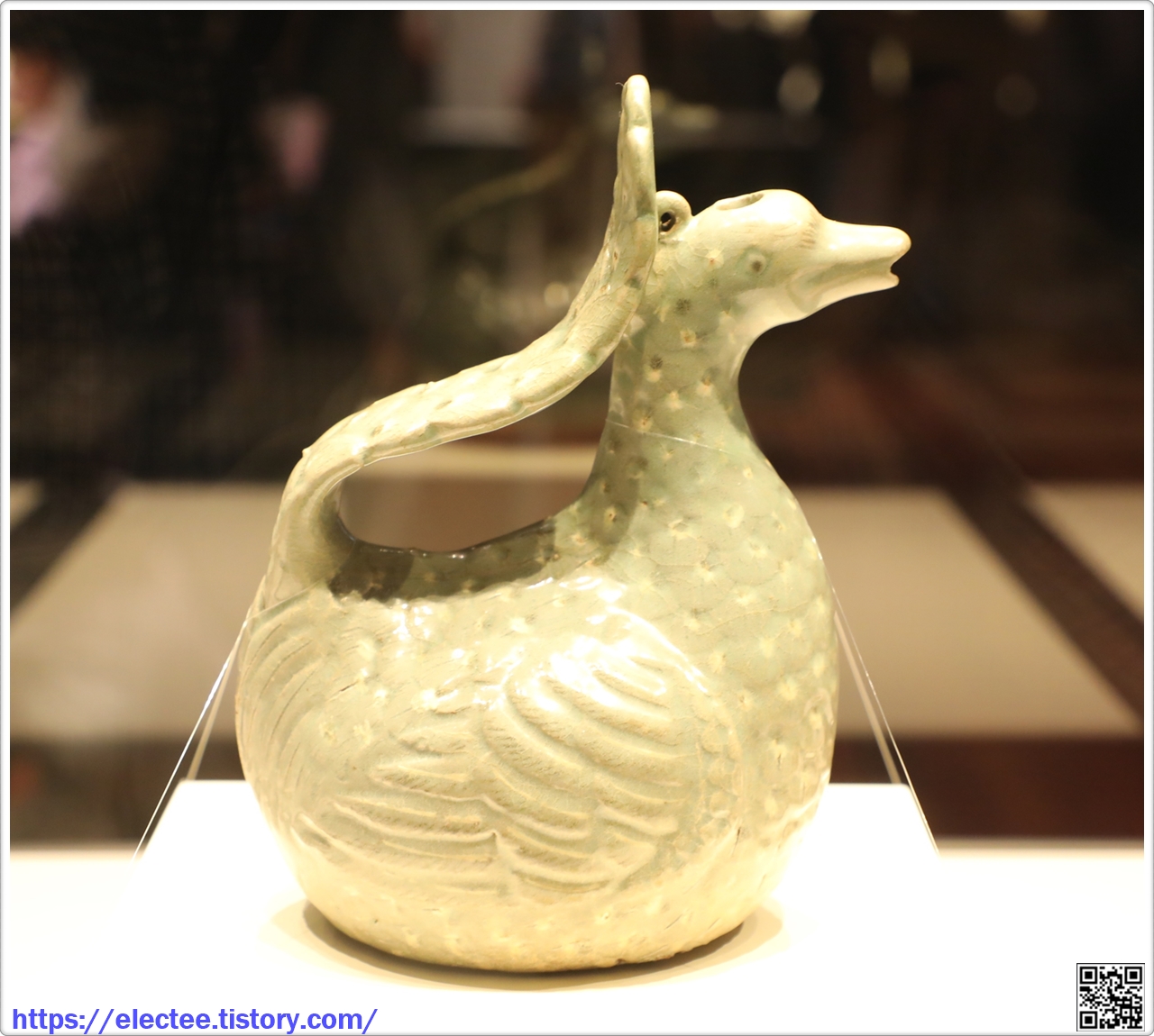 물 위를 유유히 헤엄치는 오리의 모습을 표현한 청자 주전자이다. 머리 위에 있는 구멍으로 음료를 부어 넣고, 툭 튀어나온 부리 끝으로 따른다. 오리의 꼬리를 과장되게 휘어서 손잡이를 만들었다. 머리 뒷부분에 작은 고리가 있는 것으로 보아 원래는 구멍을 막는 뚜껑도 있었을 것이다. 가지런히 접은 날개의 깃털을 하나하나 도드라지게 표현하여 입체감을 더하였고, 몸통 전체를 덮은 반점무늬 깃털은 색이 다른 흙을 메워서 구워내는 상감기법으로 만들었다.