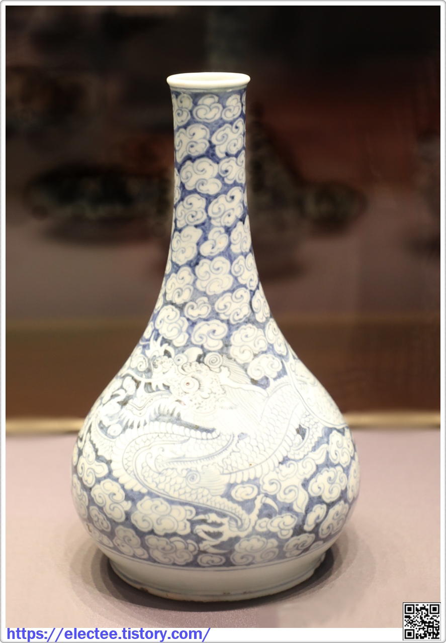 구름무늬 백자의 문양은 이전과 다르게 바탕 면을 청화 안료로 파랗게 칠하는 방식으로