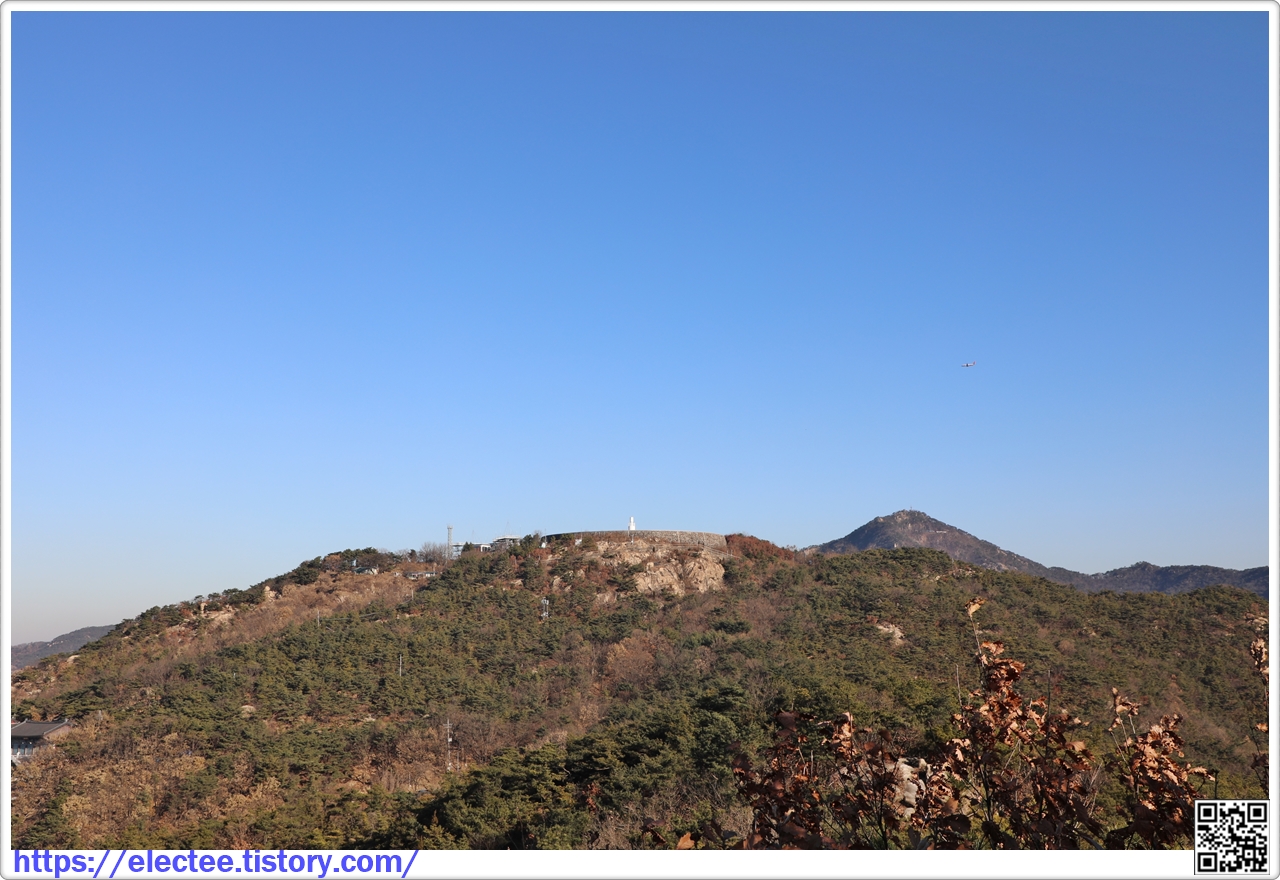 삼성산 정상 위로 나는 비행기가 장난감 크기만큼 작다.