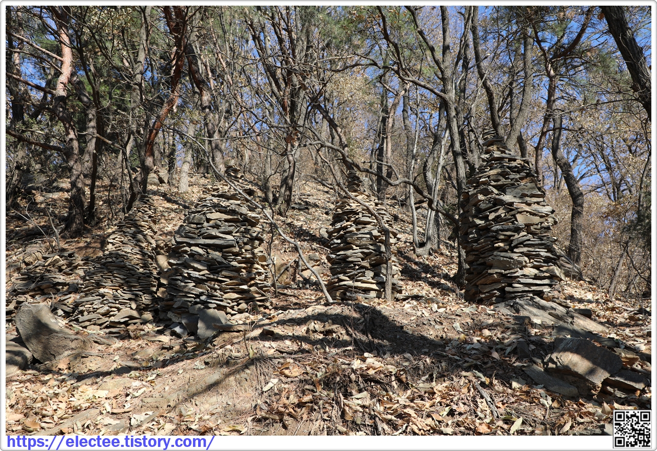 하산 구간엔 얇게 쪼개진 돌이 많아 예닐곱 개의 작은 돌탑을 쌓았다.