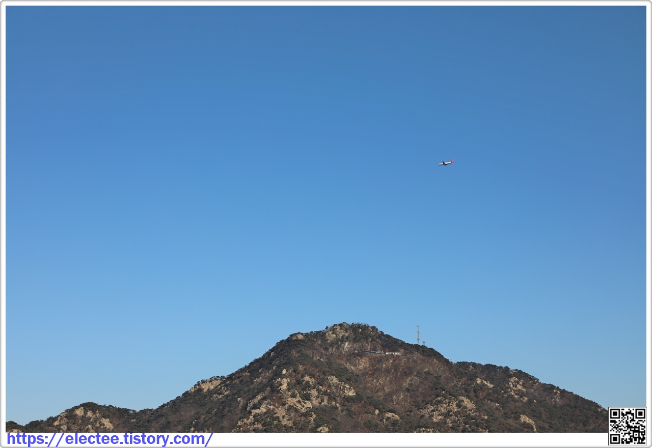 삼성산 정상 위로 나는 비행기가 장난감 크기만큼 작다.