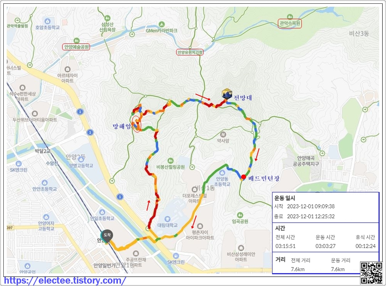 2023. 12. 1. (금) 09:09~12:25, 3시간 15분 산행, 12분 휴식 포함, 7.6km 이동