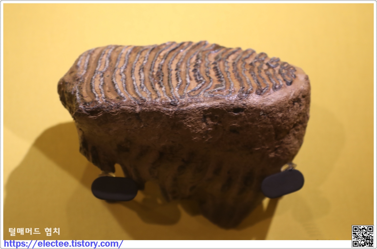 매머드의 협치 : 매머드의 이빨은 조밀하게 붙어있는 구조로 풀을 잘 씹을 수 있도록 발달되었다.