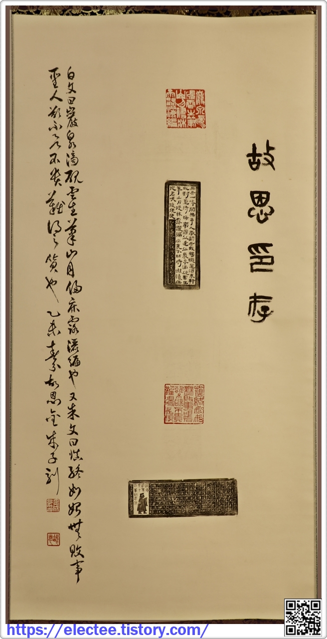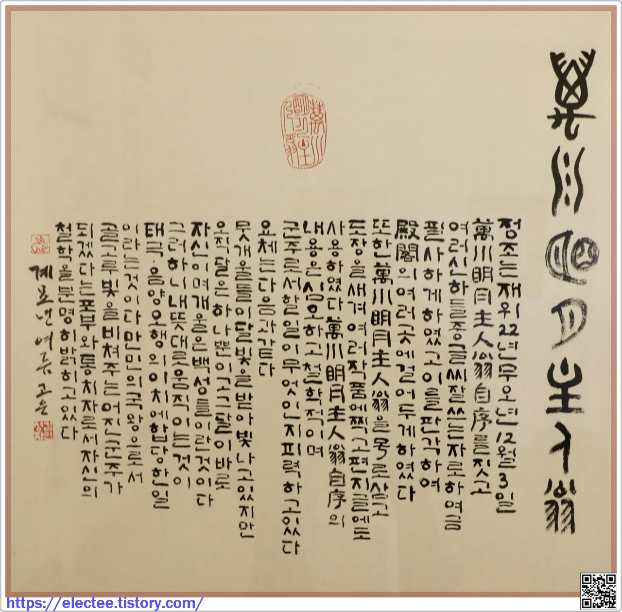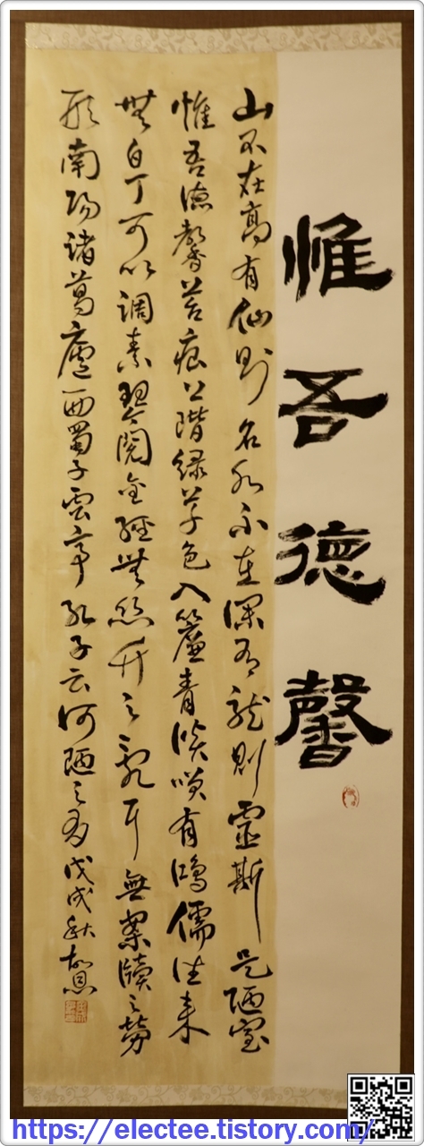 山不在高(산부재고) 有仙則名(유선칙명) 산은 높다고만 유명한 것이 아니고 신선이 살고 있어야 명산이다. 水不在深(수부재심) 有龍則靈(유룡칙령) 물은 깊다고만 유명한 것이 아니고 그속에 용이 살고 있어야 신령스럽다. 斯是陋室(사시누실) 唯吾德馨(유오덕형) 이 누추한 방이지만 오직 내가 덕망을 갖고 살고 있으니 향기롭구나. 苔痕上階綠(태흔상계녹) 草色入簾靑(초색입렴청) 이끼는 섬돌 위에까지 푸르게 자라고, 풀빛은 주름 발아에까지 비쳐 들어오는데 談笑有鴻儒(담소유홍유) 往來無白丁(왕내무백정) 함께 담소할 덕망 높은 선비가 있고, 오가는 사람들도 모두 귀하지 않는 사람 없으니 좋지 않는가. 可以調素琴(가이조소금) 閱金經(열금경) 기교와 꾸밈없는 거문고 줄 고르고 金玉(금옥) 같은 경전 읽으나니, 無絲竹之亂耳(무사죽지난이) 無案牘之勞形(무안독지노형) 어지러운 관현악의 난잡함도 없고, 관청 일로 몸 괴롭힐 일도 없으니, 南陽諸葛廬(남양제갈려) 西蜀子雲亭(서촉자운정) 여기가 제갈공명이 숨어살던 남양의 그 초가라 할까. 孔子云(공자운) 何陋之有(하누지유) 공자께서도 군자가 살면 누추한 곳이라곤 있을 수 있겠는가 西蜀(서촉) 揚子雲(양자운) 載酒亭(재주정) 서촉 양자운의 재주정에 비길 손가라고 하셨지. |