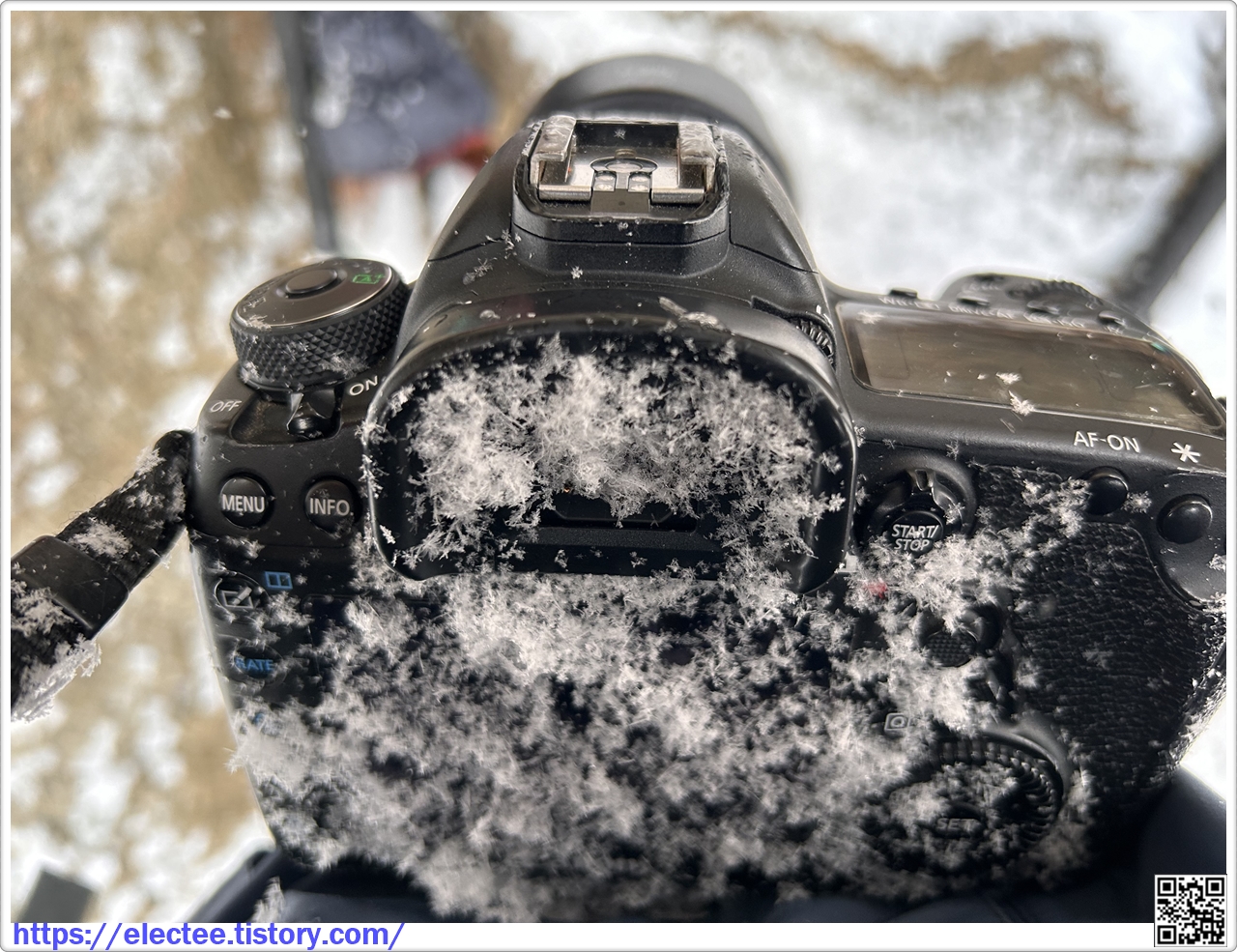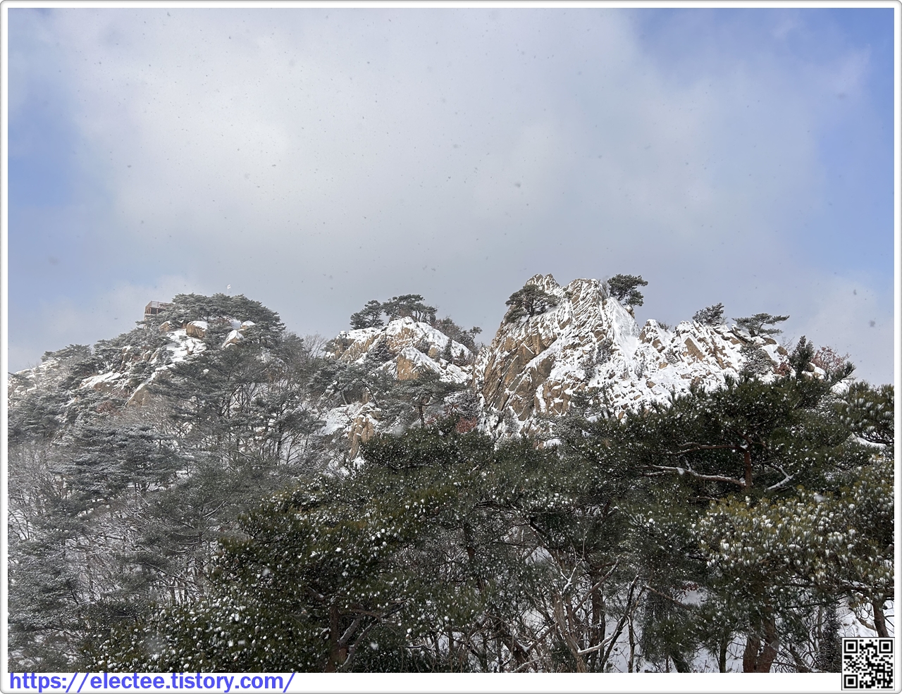 이즈음 눈이 갑자기 펑펑 내려 카메라가 망가지겠단 생각에 배낭에 넣는다.