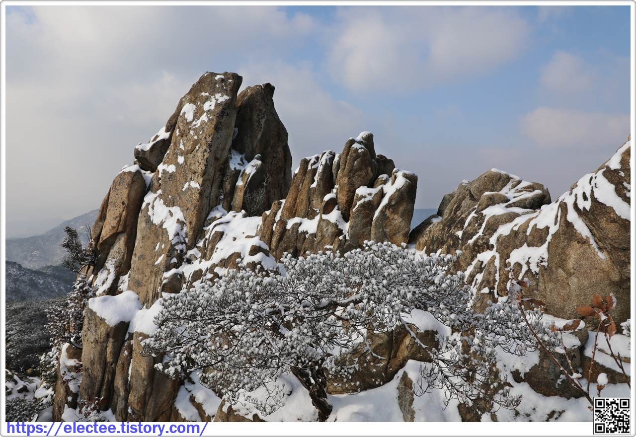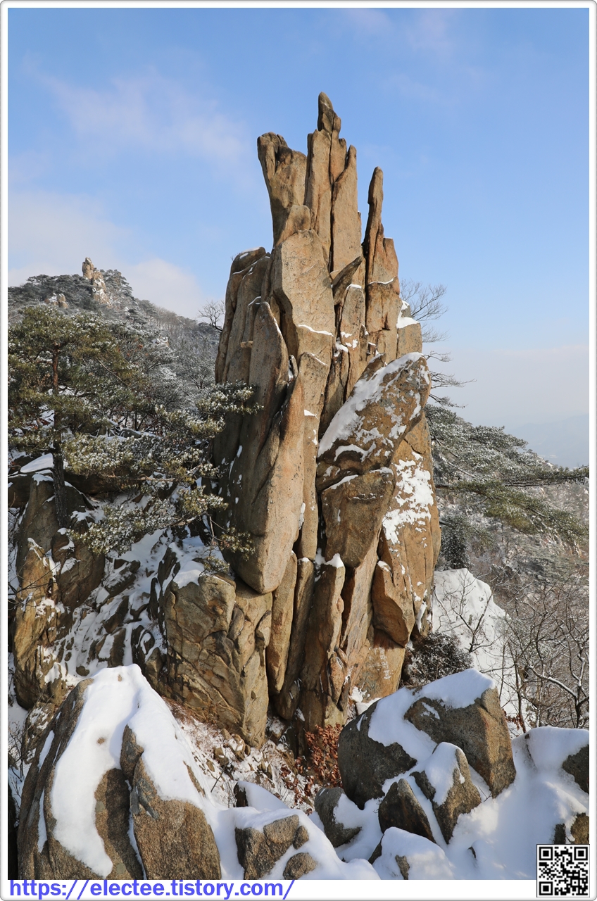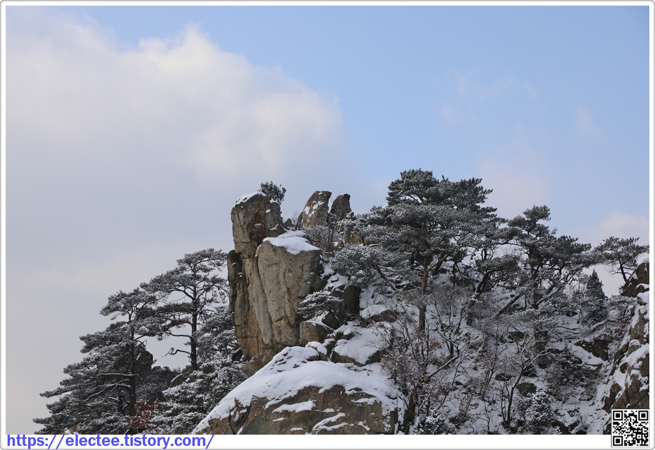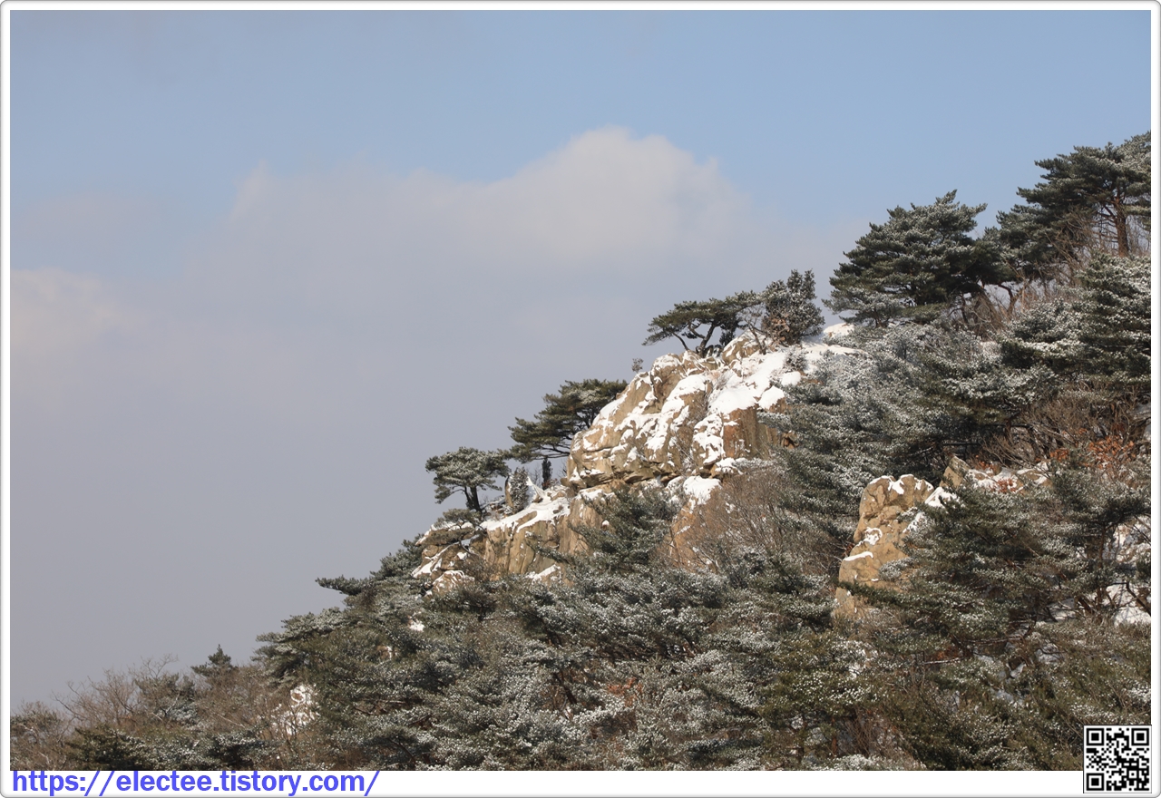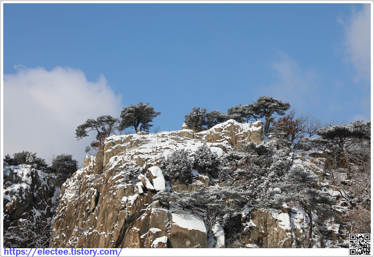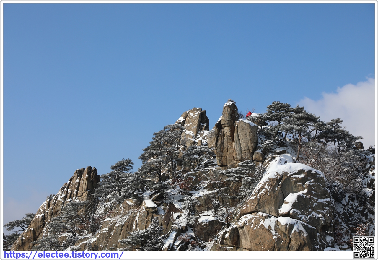 팔봉능선의 시원하게 보이는 암릉도 눈이 앉을만한 공간에 방을 튼 흰 눈이 더 아름답게 보인다.