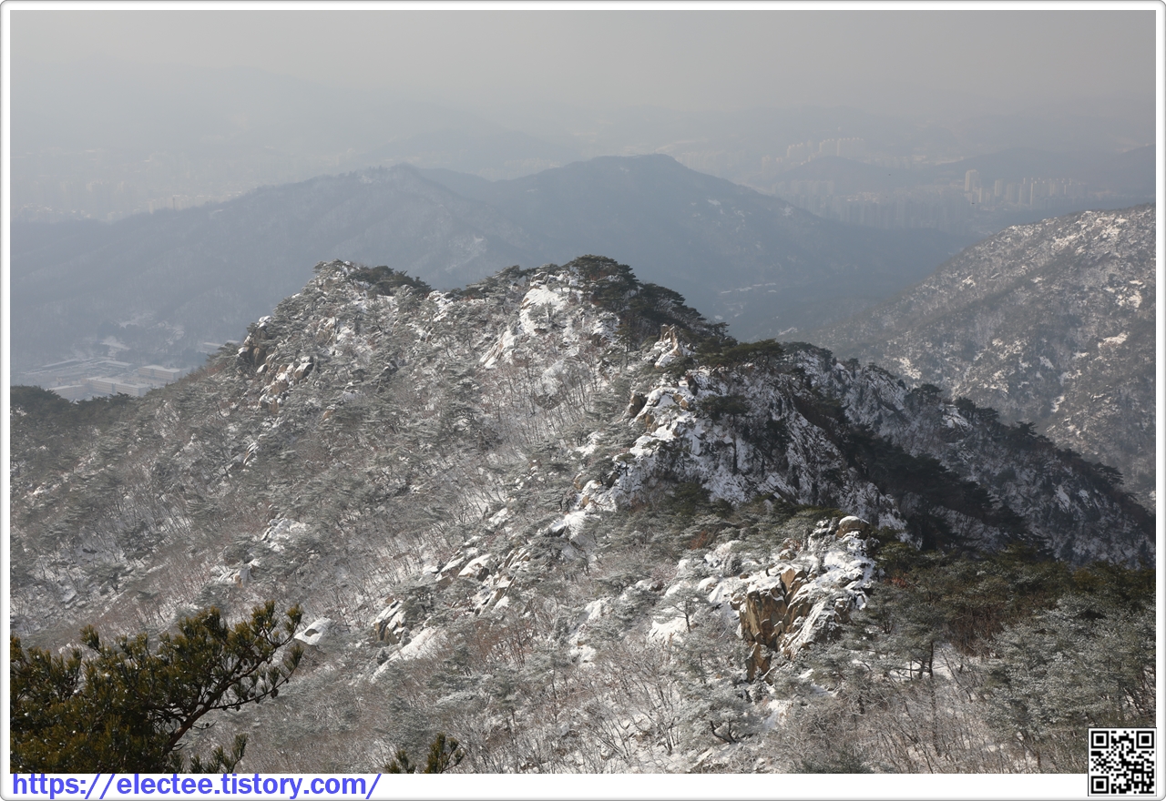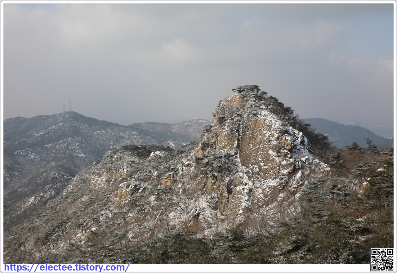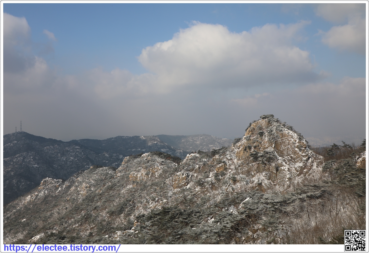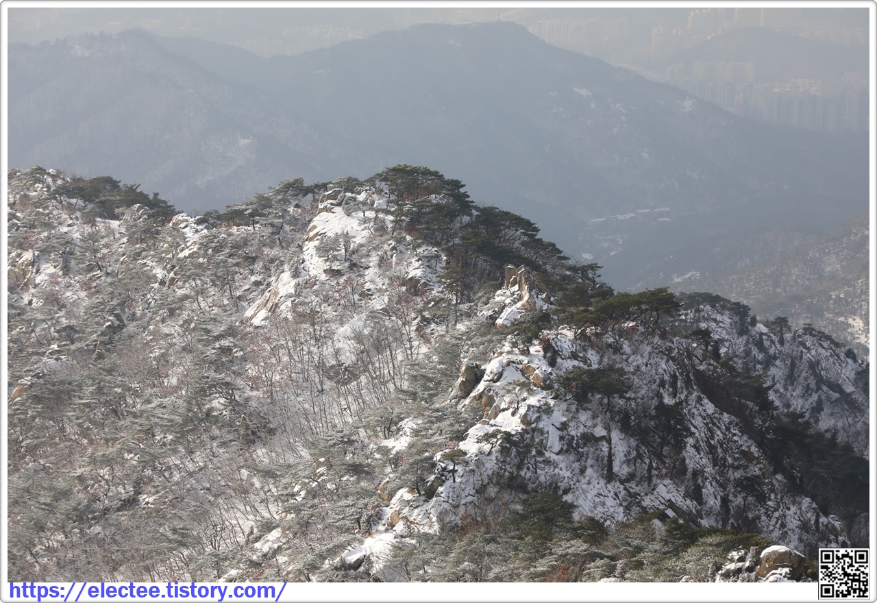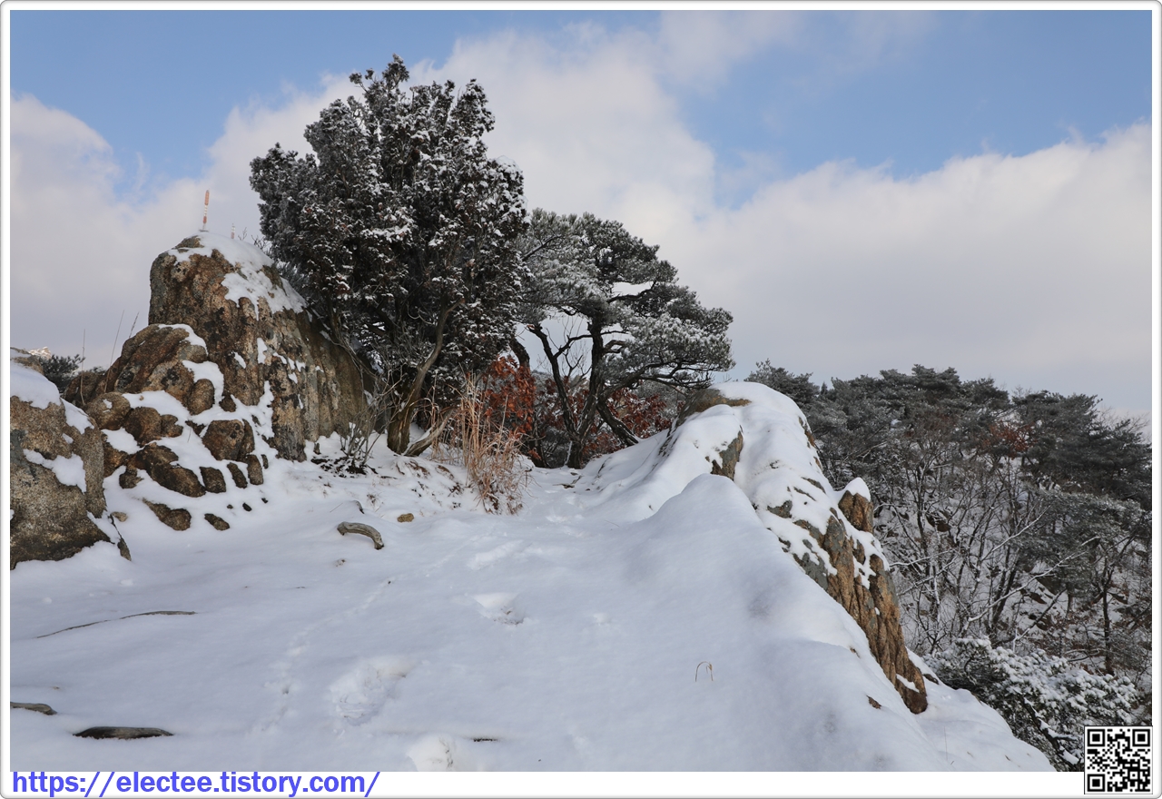 팔봉능선의 시원하게 보이는 암릉도 눈이 앉을만한 공간에 방을 튼 흰 눈이 더 아름답게 보인다.