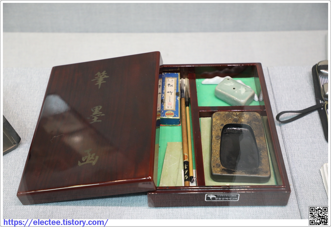 달력을 뜯어 쓴 메모지와 펜과 잉크 벼루 등이 인상 깊게 보인다.