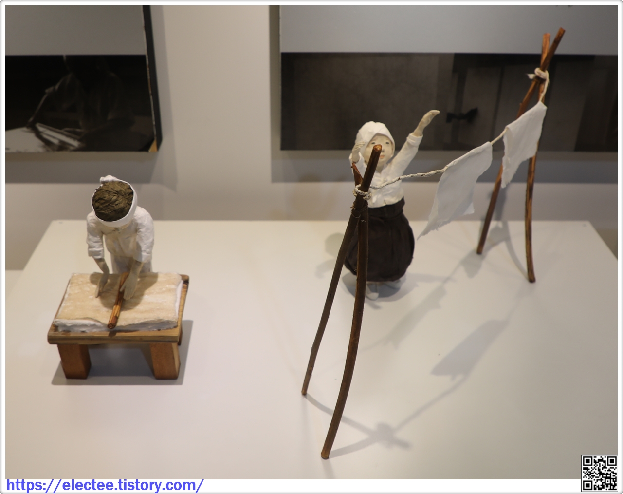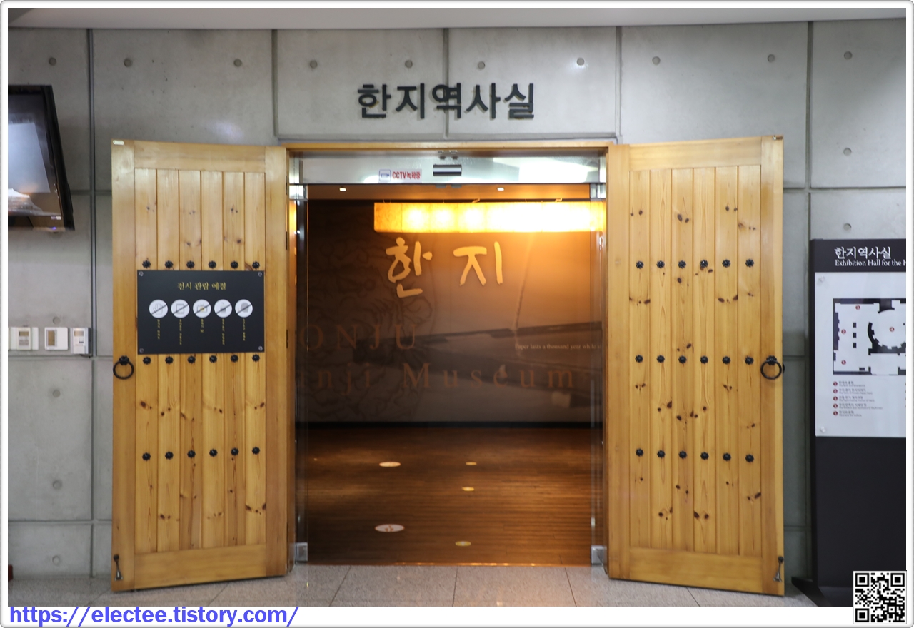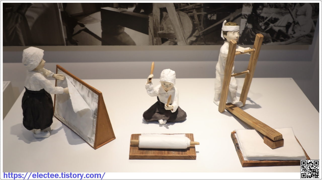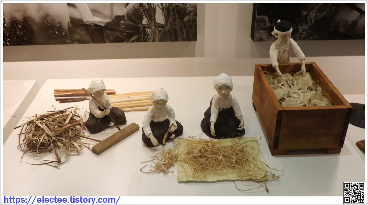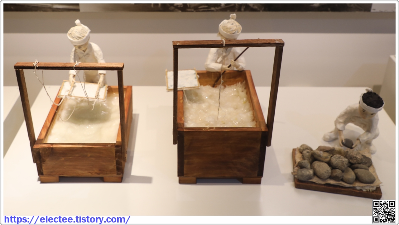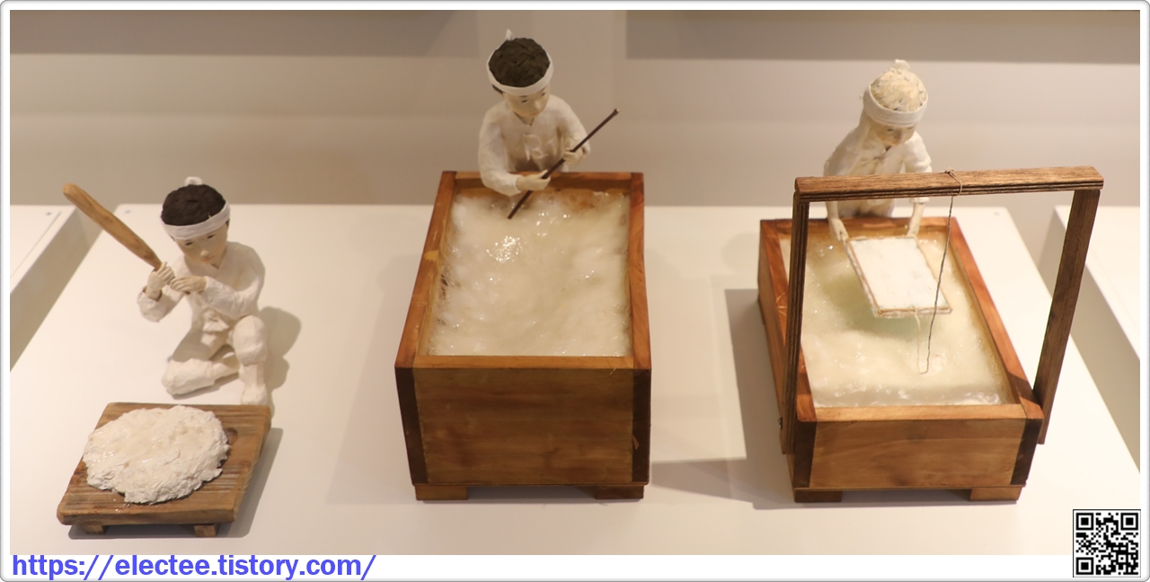 2023_220 2023. 11. 25. 토요일 오후에 관람 앞서 1층 역사실에서 한지 제조 기술이 언제 우리나라에 전래되었고, 이후 어떻게 발전했는지를 살펴보았다. 옛날과 달리 이젠 기계로 만든 한지를 손쉽게