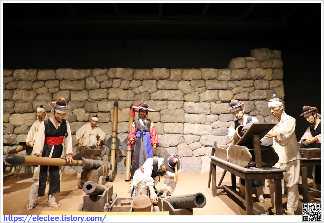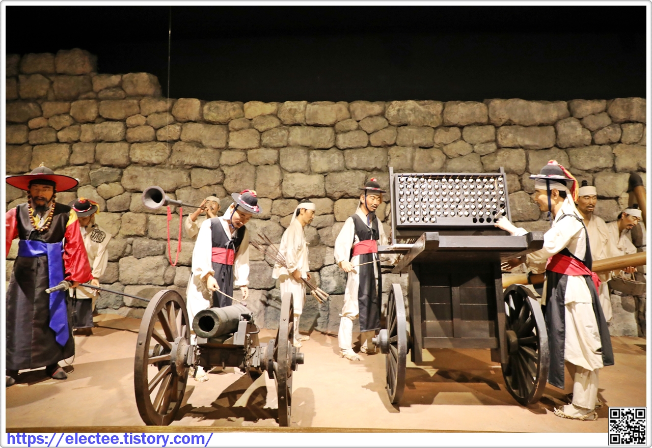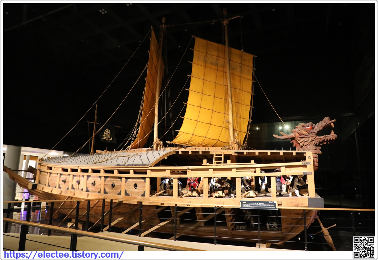 거북선은 이순신 장군이 임진왜란 때 사용한 전투용 배로, 바다에서의 전투를 승리로 이끈 주역이다. 거북 모양의 전투선으로 앞에는 용머리를 붙이고 좌· 우에는 대포를 달았으며, 등에는 철판을 두르고 쇠못을 꽂아 적의 침입을 막았다. 이 모형은 조선 정조 때 사용했던 거북선을 기초로 전쟁 상황을 1/2.5로 축소한 것이다.