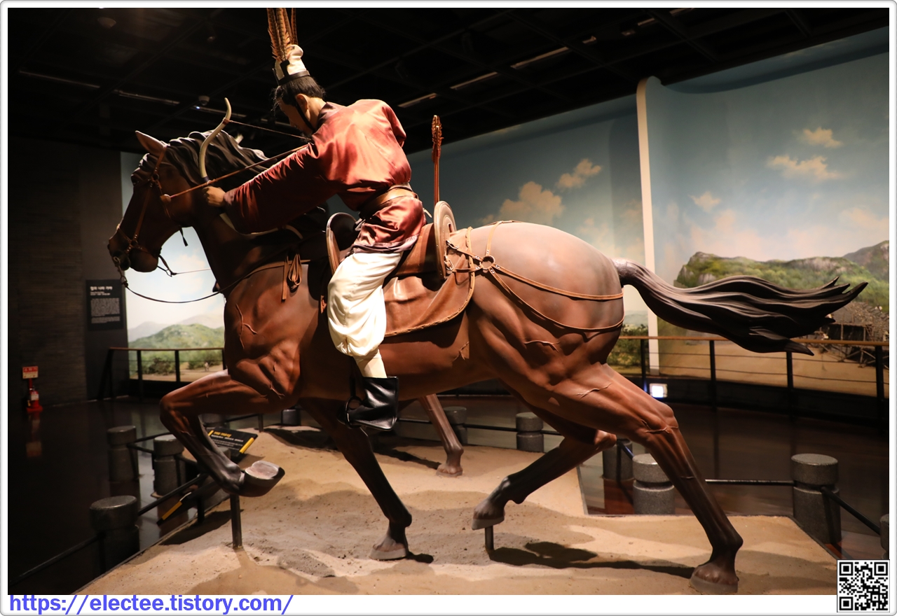 전시된 기마인물상은 무용총에 보이는 고구려인의 사냥하는 모습을 재현한 것이다. 말 위에서 자유롭게 몸을 가누며 활을 당기는 모습이 인상적이다.