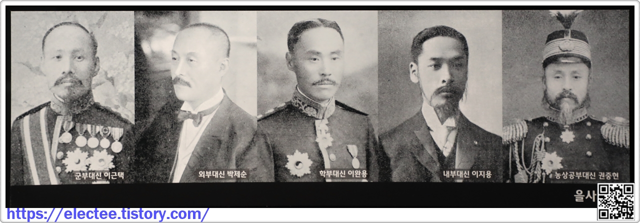 왼쪽부터 을사오적인 군부대신 이근택, 외부대신 박재순, 학대대신 이완용, 내부대신 이지용, 농성부대신 권중연