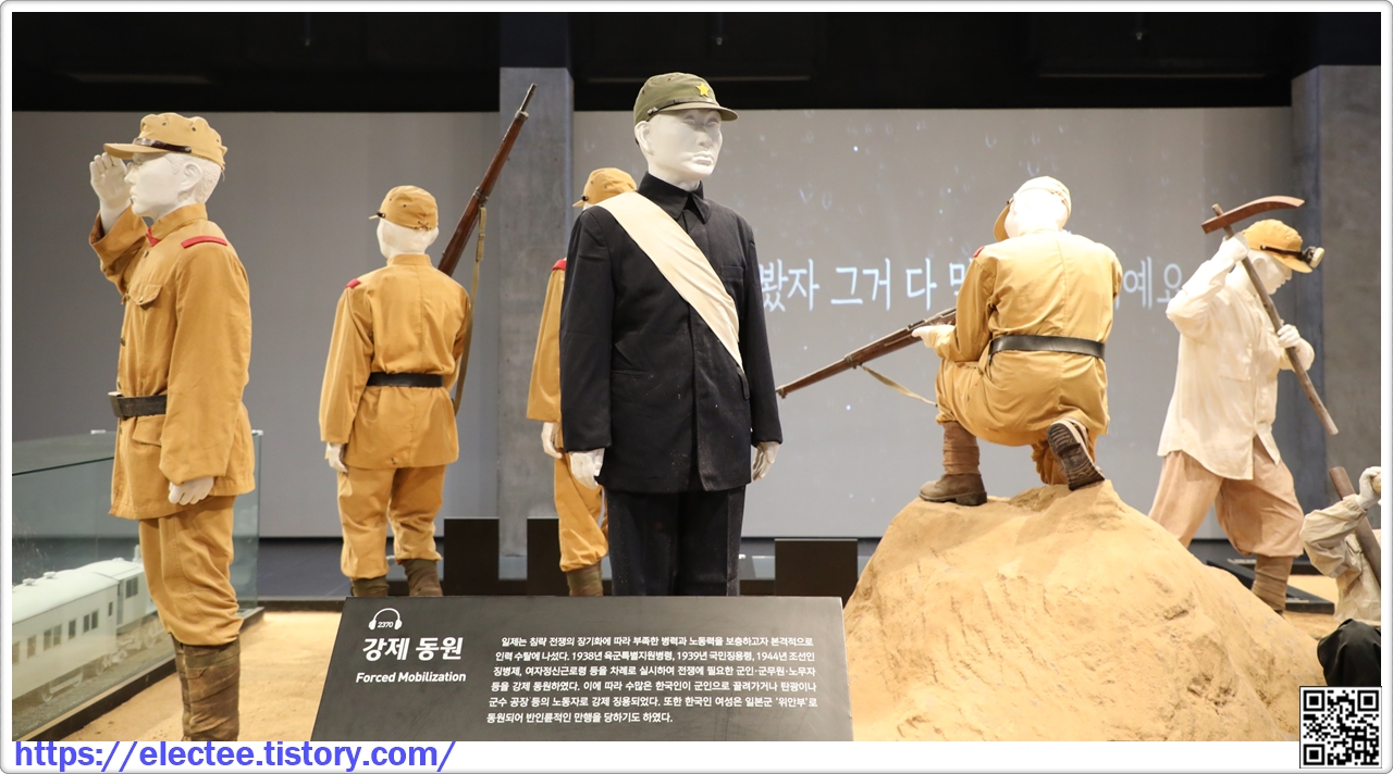 이에 따라 수많은 한국인이 군인으로 끌려가거나 탄광이나 군수 공장등의 노동자로 강제 징용되었다. 또한 한국인 여성은 일본군 '위안부'로 동원되어 반인륜적인 만행을 당하기도 하였다.