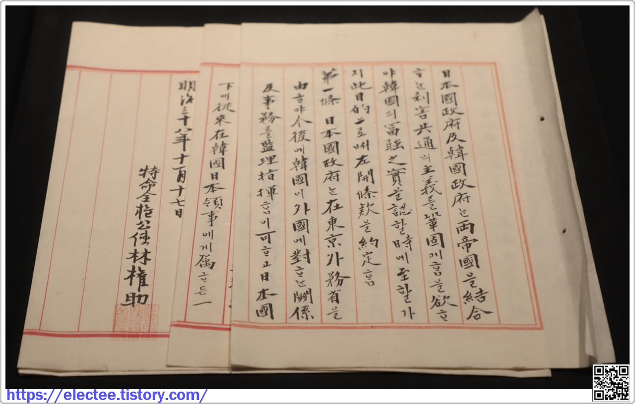 1905년 11월 17일 대한제국 외부대신 박제순과 일본 특명전권공사 하야시 스케사이에 체결된 을사늑약乙巳勒約의 전문이다. 일본 정부가 대한제국의 대외관계 및 그 사무를 감독 지휘하고 통감부 및 이사청을 설치하는 등 총 5개의 조항으로 이루어져 있다. 조약 체결은 군대를 동원한 강압과 협박에 의해 이루어졌고 양국의 최고통수권자의 전권 위임장과 비준서가 없는 등 국제법적 절차와 형식마저 갖추어지지 않았기 때문에 원천무효였다.