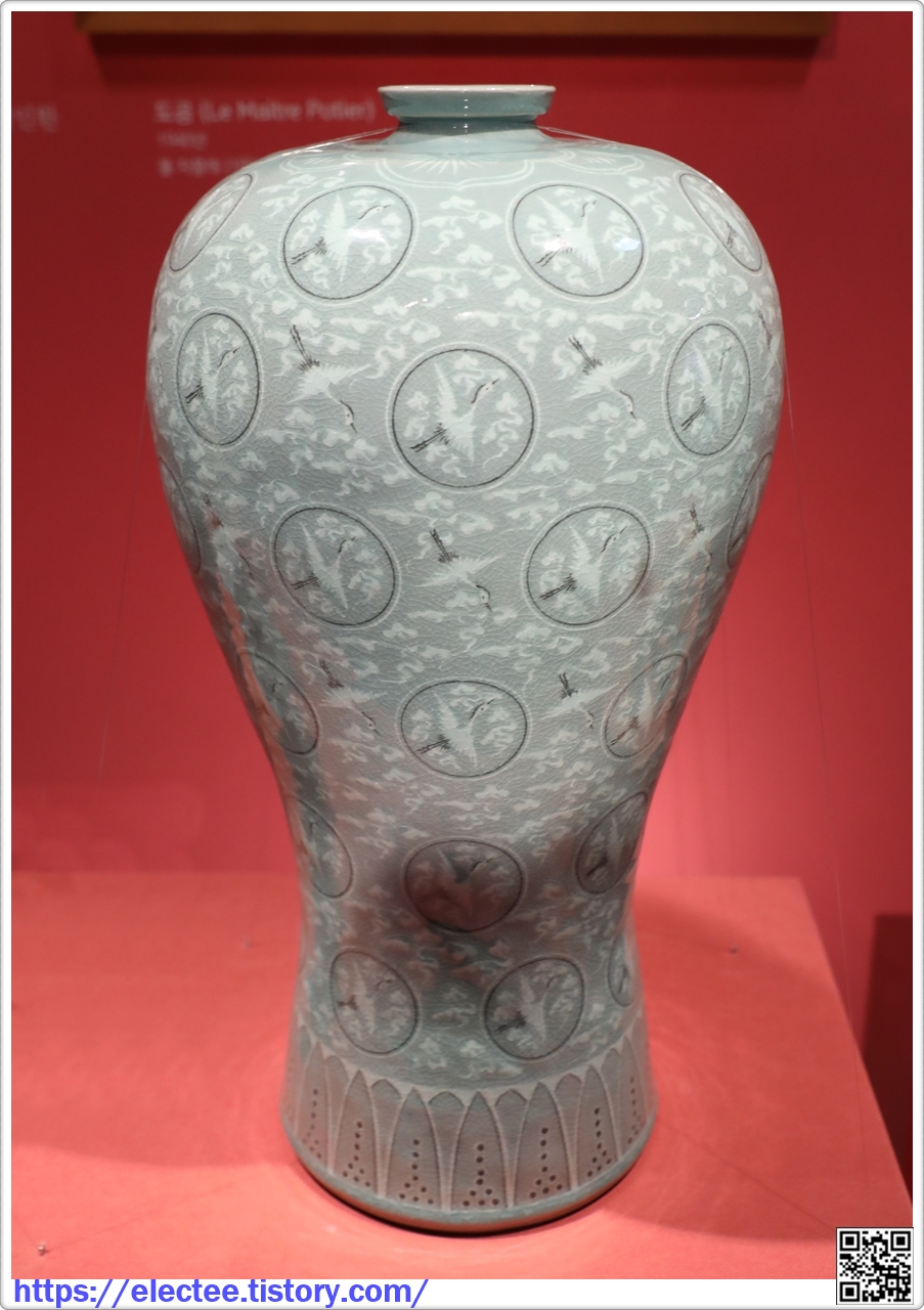 절정기의 고려청자를 대표하는 <청자상감운학무늬 매병>을 재현한 작품이다. 상감기법으로 흑백의 원 테두리 안에 운학