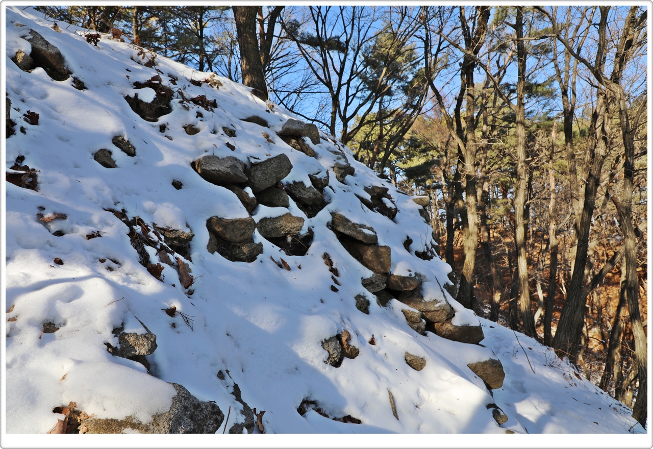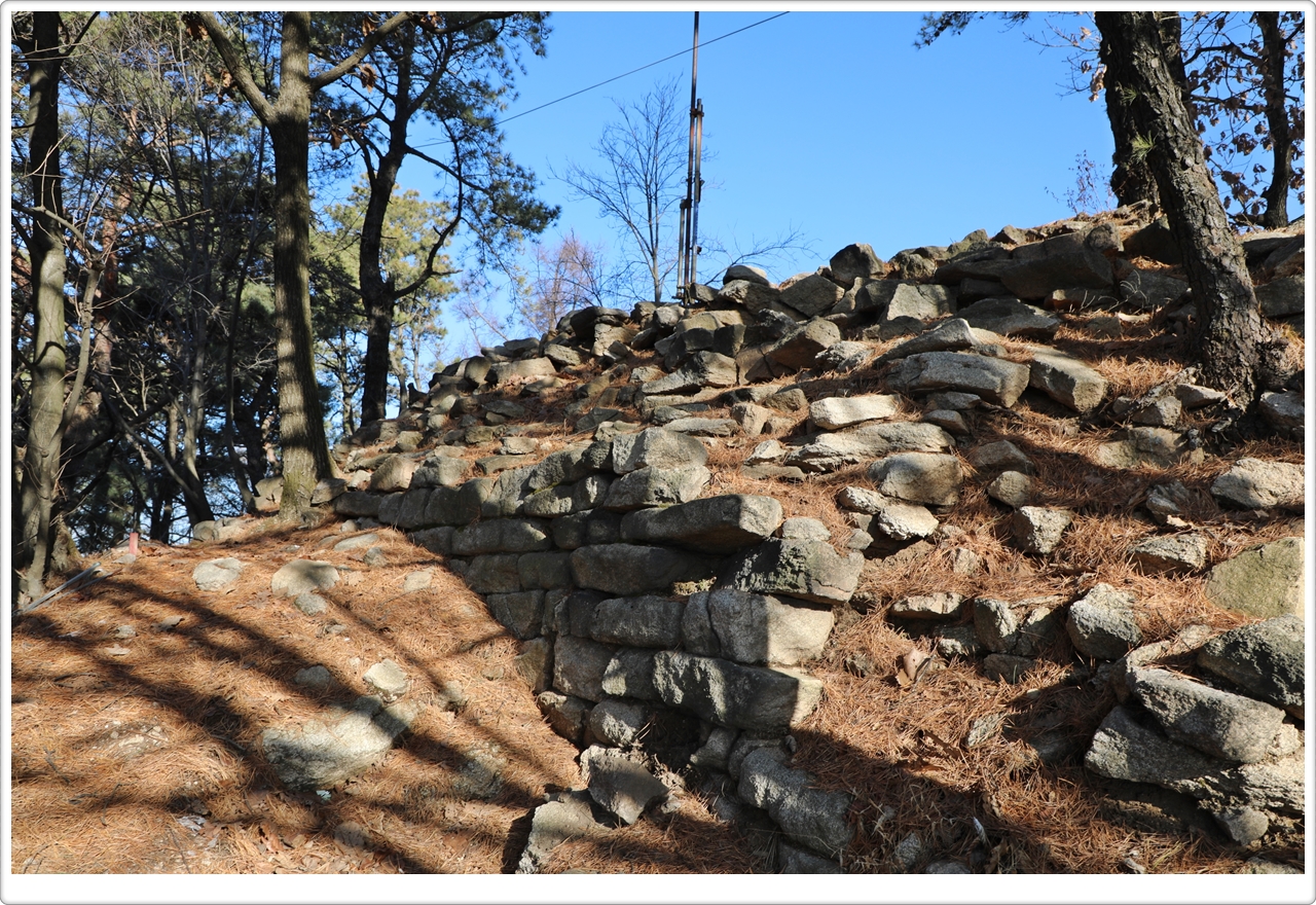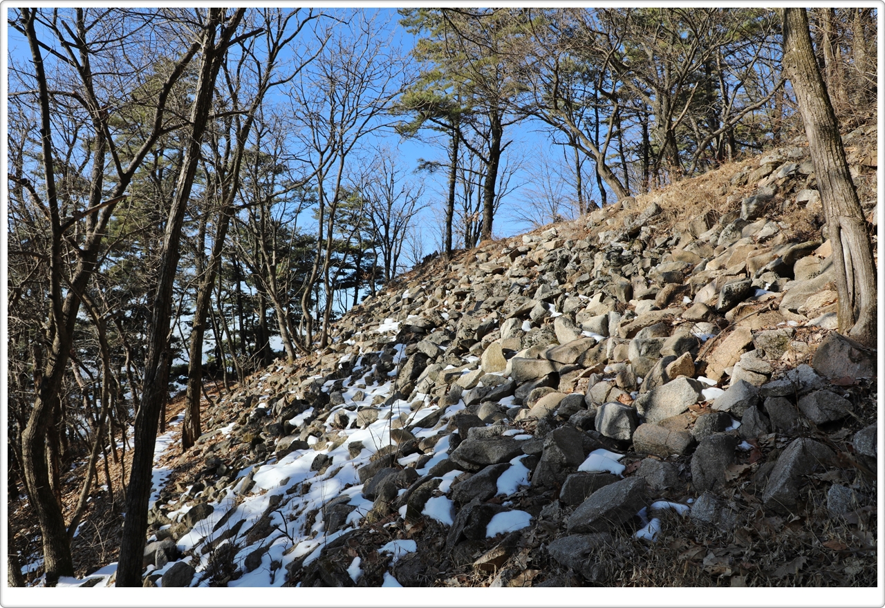 잠깐 올라왔던 정상에서 남쪽으로 난 등산로를 따라 성벽을 따라 내려가며 보니 남벽은 무너진 성벽이 산비탈을 덮었다.