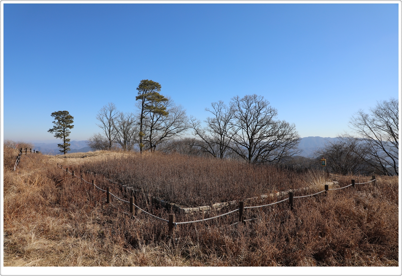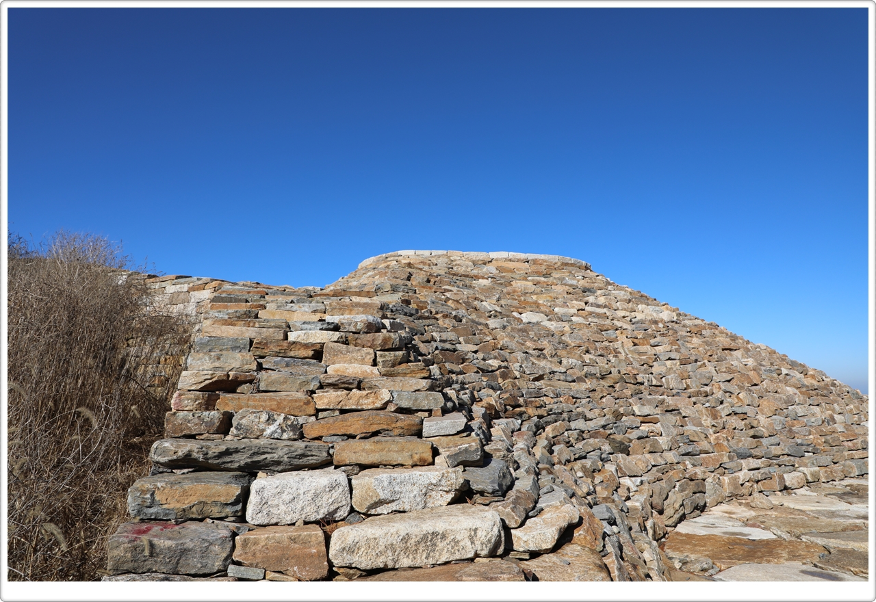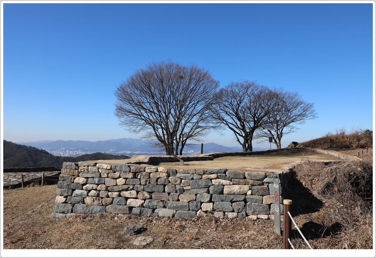 This beacon signal station, located on top of a ridge inside the south gate of Gyejoksan Fortress, is enclosed by a protective wall and divided into two sections.
