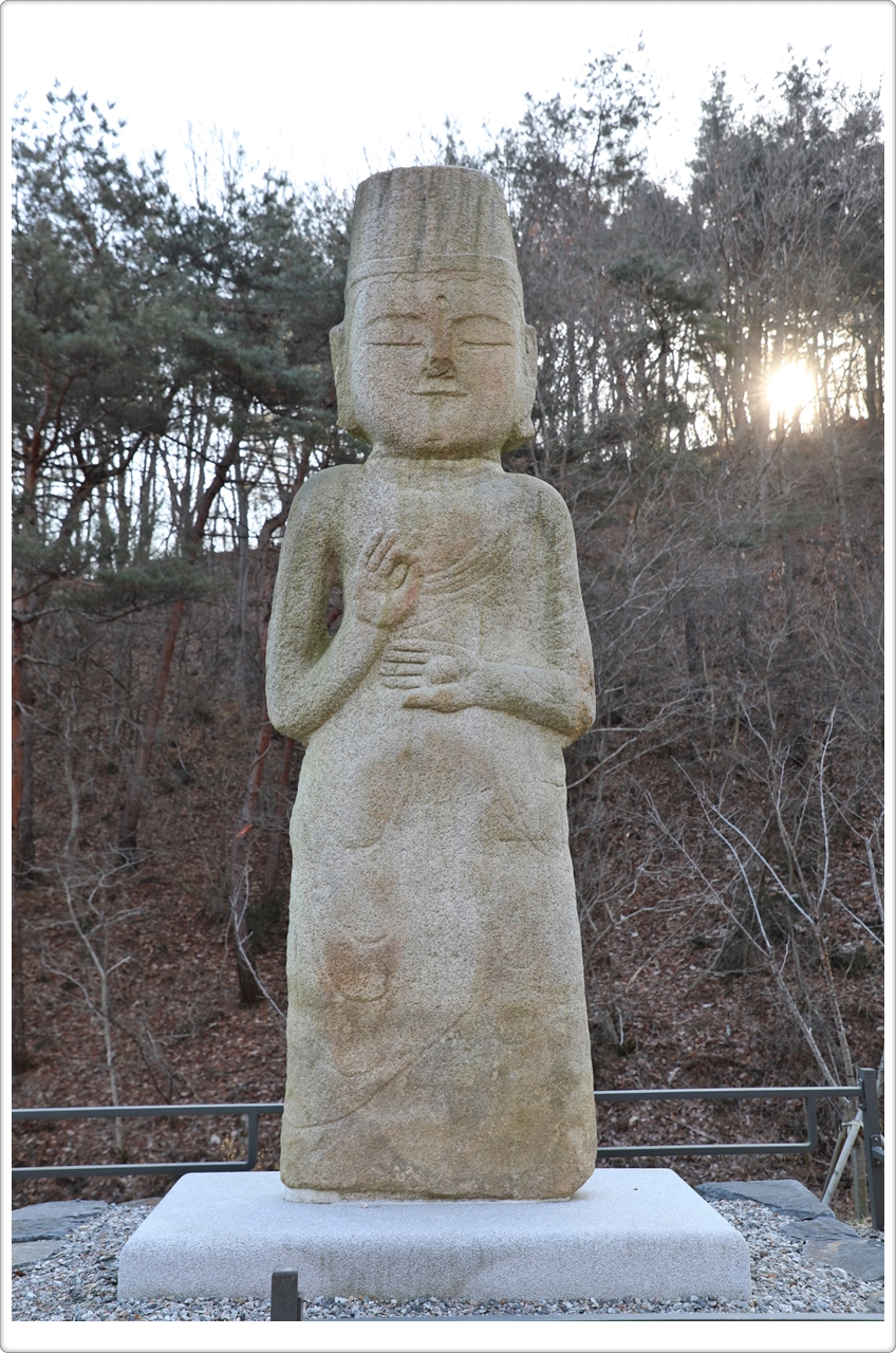 늘씬한 몸매를 자랑하는 석불의 발은 보이지 않고 최근 깎은 돌 기단에 모셔져 있다.