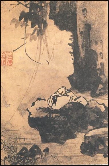 이 그림은 덩굴과 깎아지른 듯한 절벽을 배경에 두고 바위에 기대어 엎드린 자세로