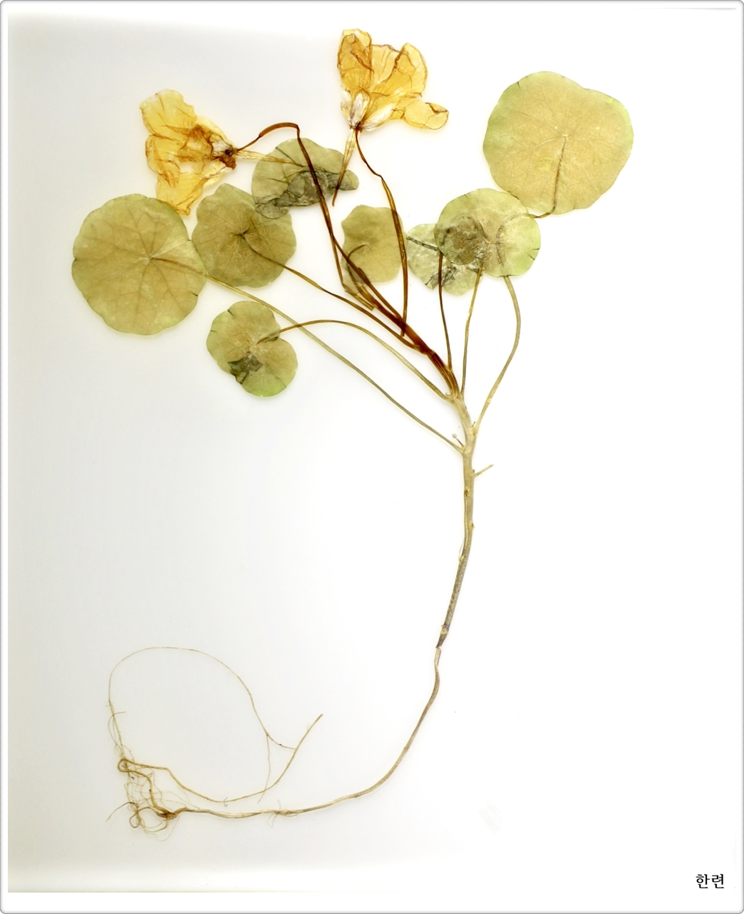 연꽃과에 속하는 다년생 수초이다. 연녹색을 띠는 둥근 형태의 잎은 뿌리줄기에서 나와 물 위를 향하며 물에 젖지 않는다.