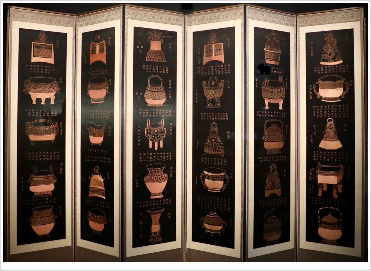 여섯 폭의 자수병풍으로, 각 폭에 5개씩 총 30개의 기물을 수놓았다. 검은색 바탕천에 황색 실로 수를 놓았으며, 도안을 중심으로 오른쪽에는 기물의 명칭을 표기하였다. 명문 부분은 한문의 삐침까지 정교하게 이음수로 표현하였다.