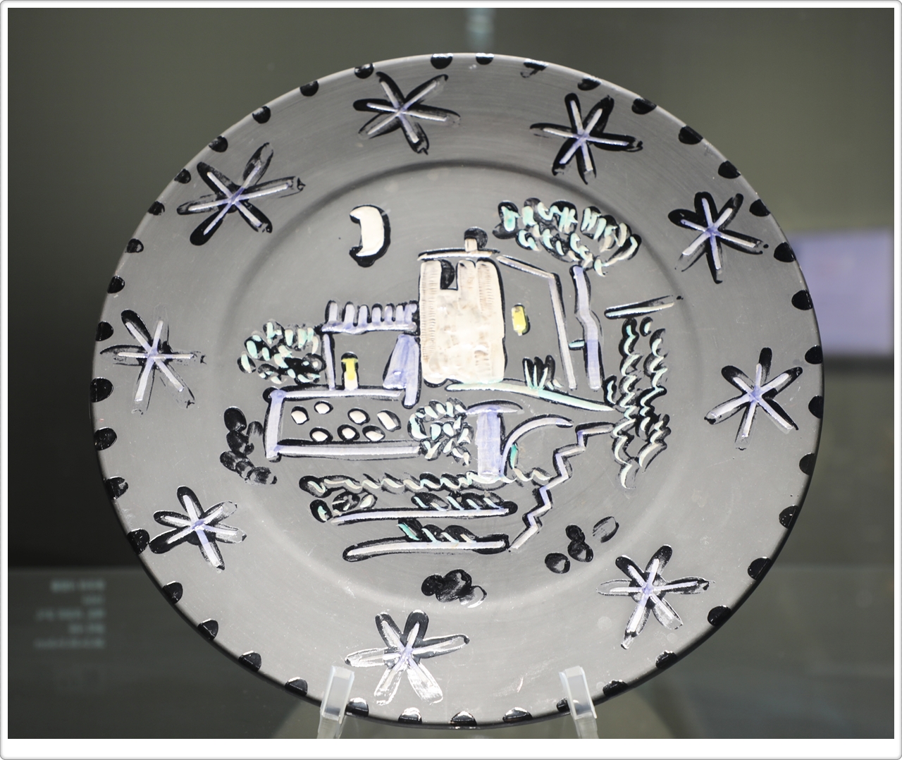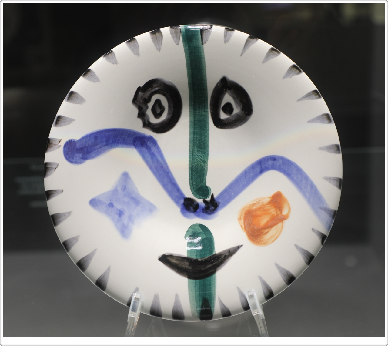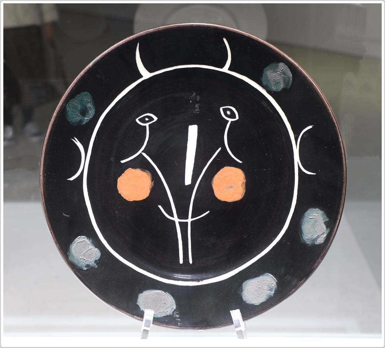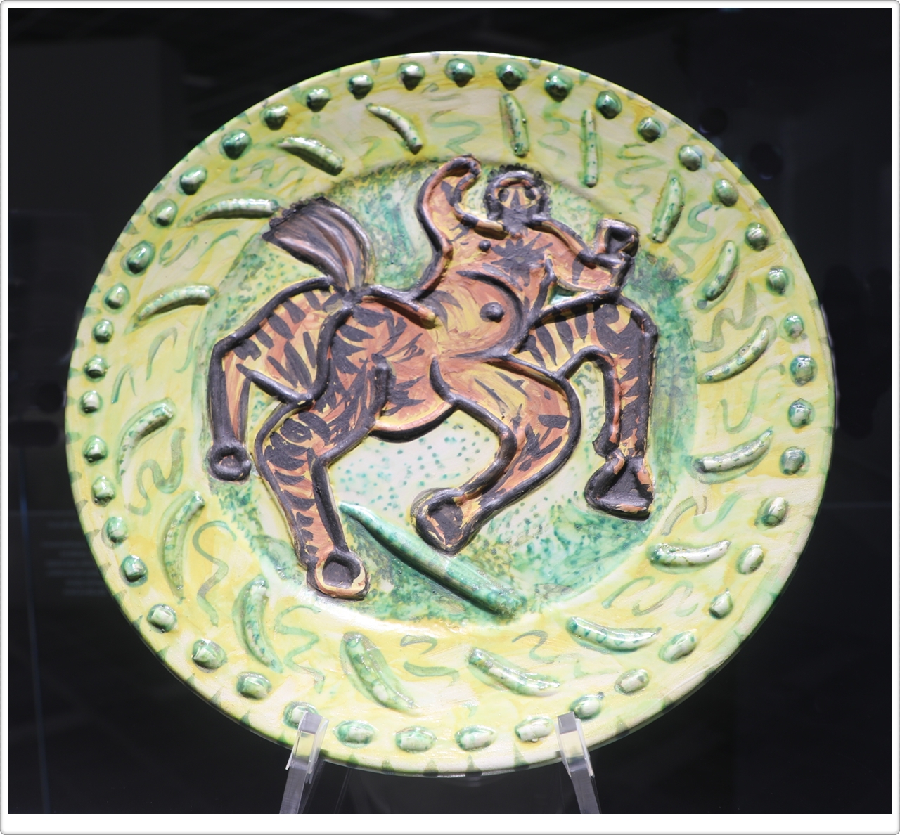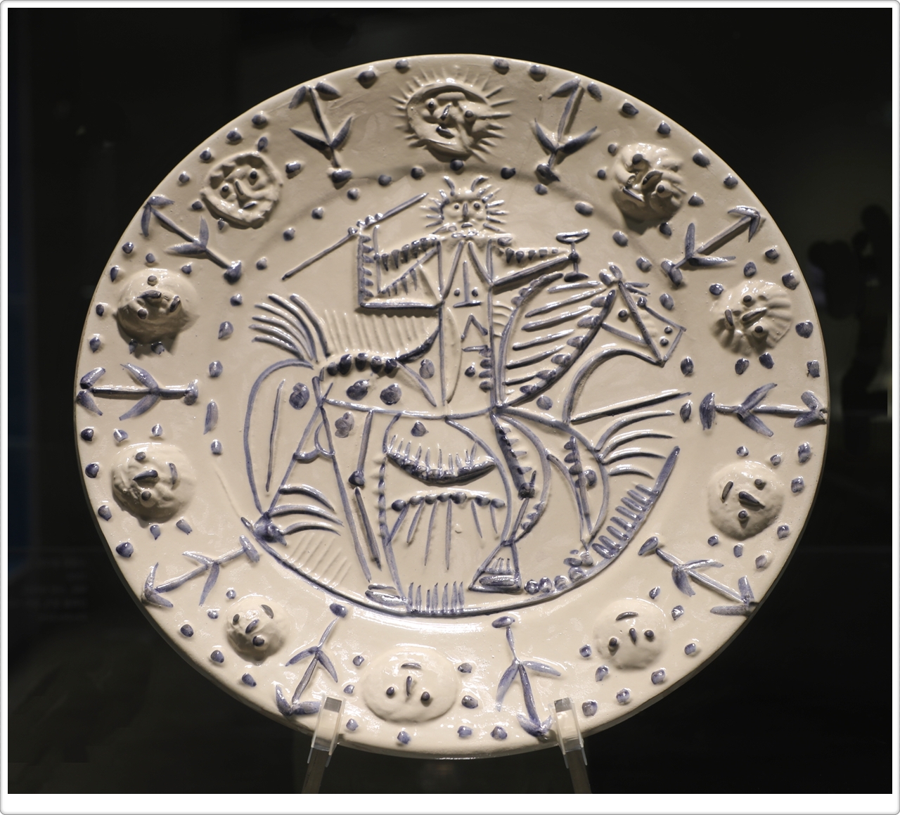 전시에 소개된 4점의 작품은 접시 가운데를 켄타우로스로 배치하고 주변을 구경꾼으로 장식했는데, 납작한 챙 모자를 쓴 남자들, 만띠야를 입은 여자들, 아이들 등 투우의 한 장면을 연상시키기도 합니다. 신화 속 인물은 피카소 작품 전반에 투영된 원초적 남성성과 정체성을 반영하는 주제였습니다.