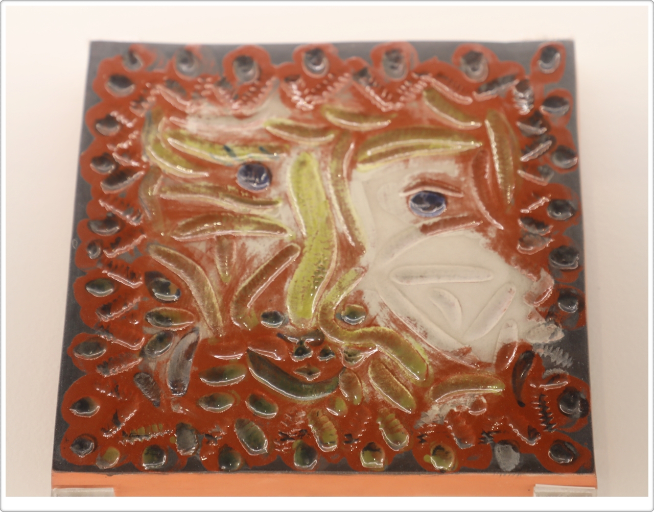 1920년대 후반, 피카소는 판화 제작(동판화)을 본격적으로 시작했으며 평생 2500여점의 판화작품을 남겼습니다. 1945년에는 새로운 기술을 작품에 도입하기 위해 석판화를 시작했으며, 이후 리노컷이라 불리는 리놀륨 판화(목판화와 유사한 부조판화)를 제작했습니다. 도예를 시작할 무렵이었으므로 자연스럽게 도예에 판화기법을 적용하고 그 접점을 실험하기도 했습니다. 전시에는 리놀륨에 각인한 것을 석고판에 캐스팅한 후 점토나 테라코타판에 찍어낸 사각형의 타일형태가 9점 설치되었습니다.