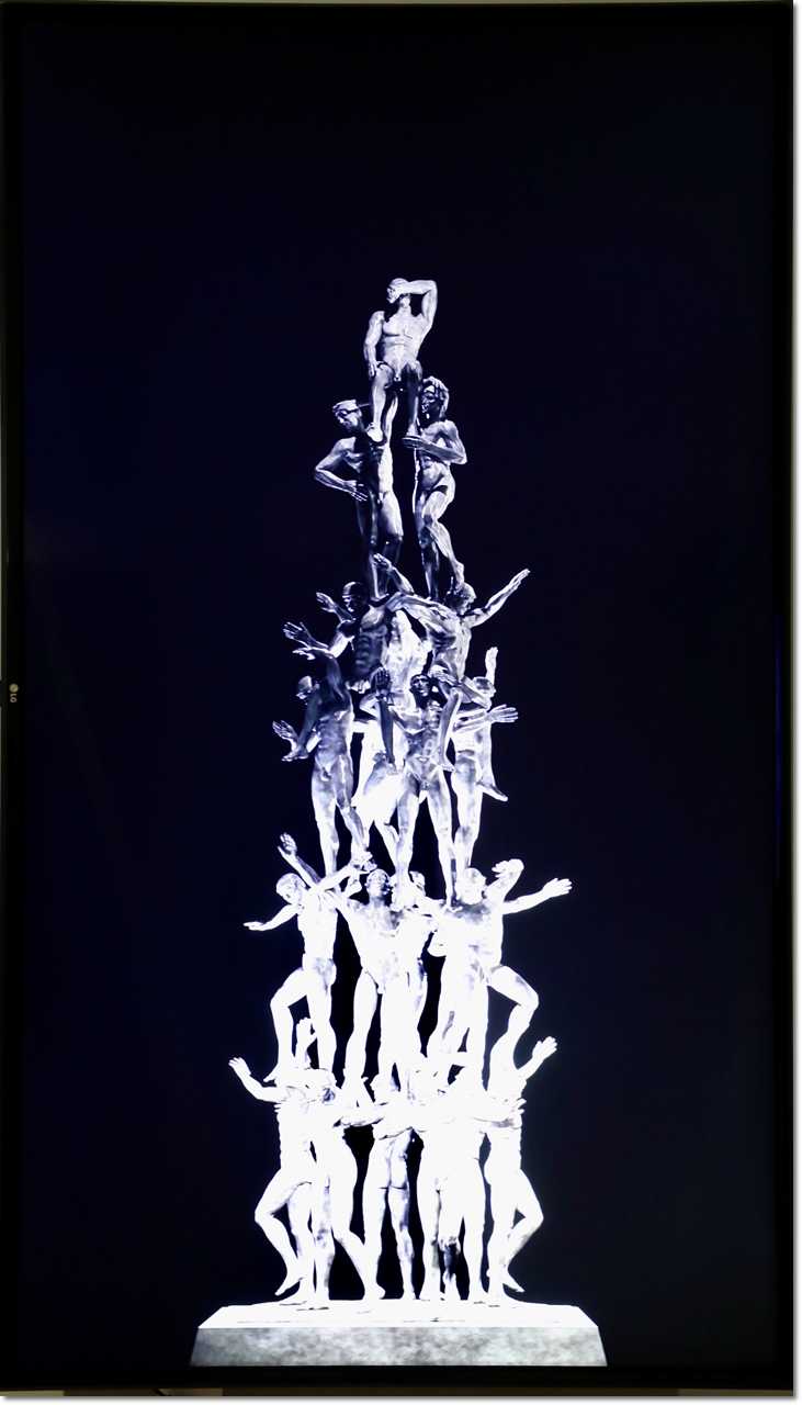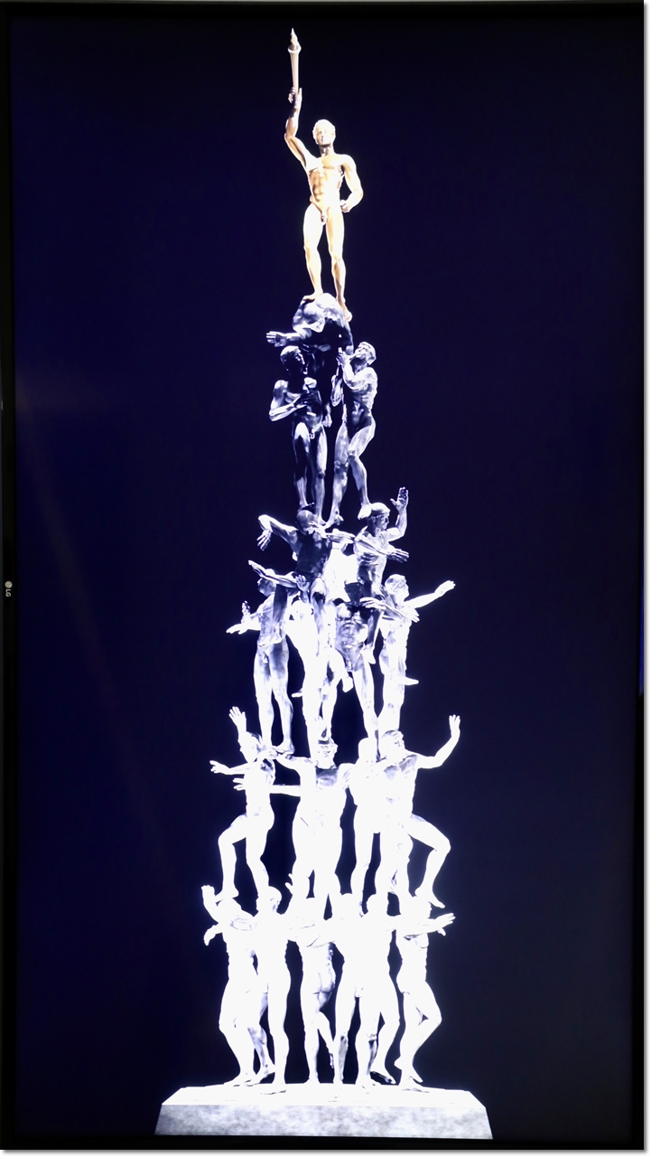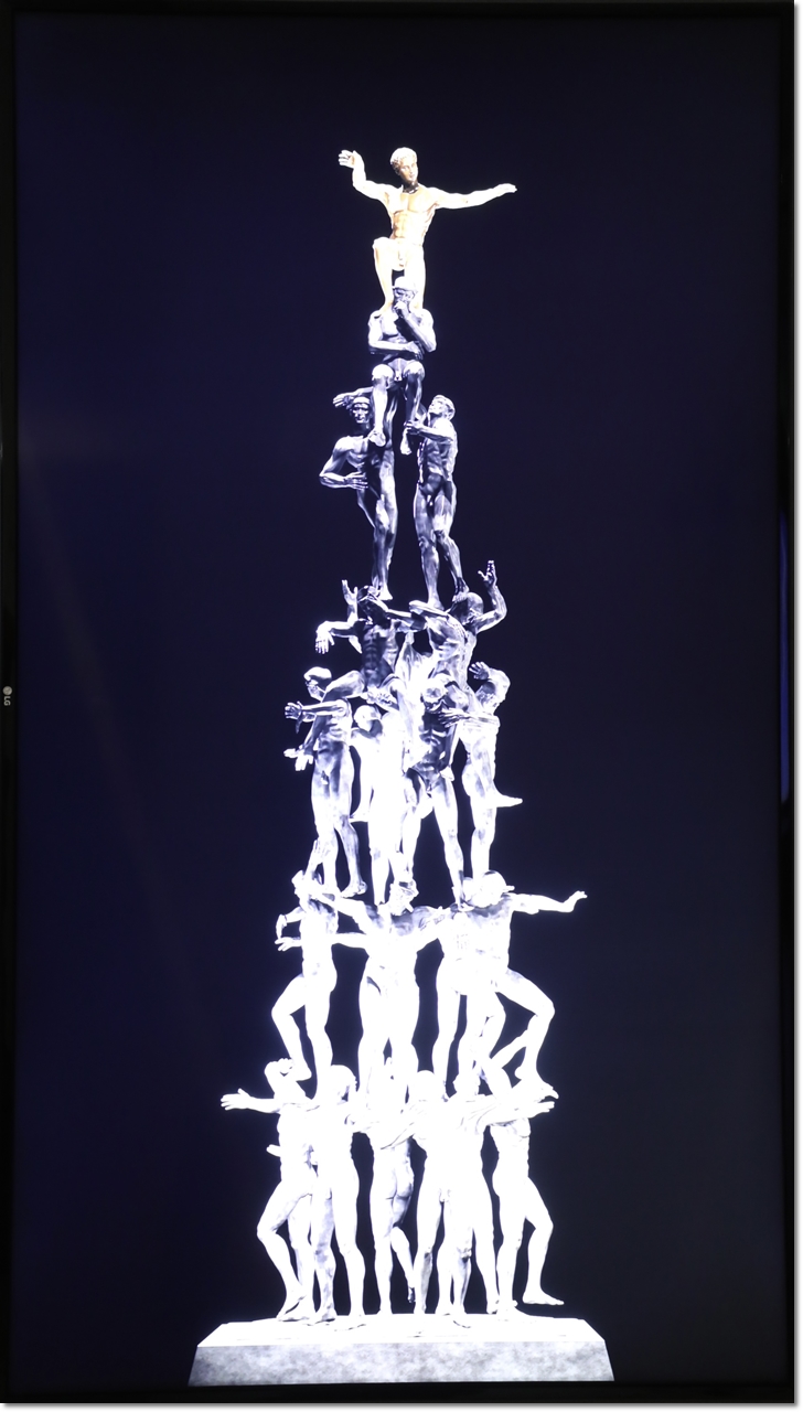 벌거벗은 남성들이 3층?까지 쌓인 상태에서 한 층 더 쌓고 마지작에 황금 도금을 한 남성이