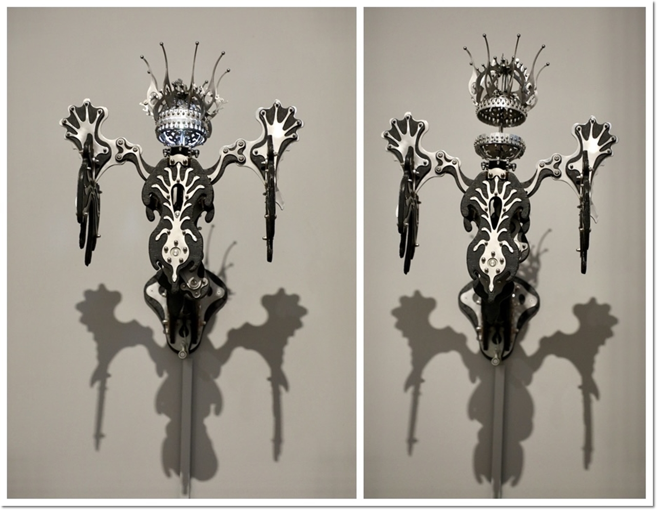 춤추는 가면_어둠먹는 기계, 2011, 철, 전자장치, DC 모터, LED, 불에 태운 나무, 55×44×46cm, 6kg