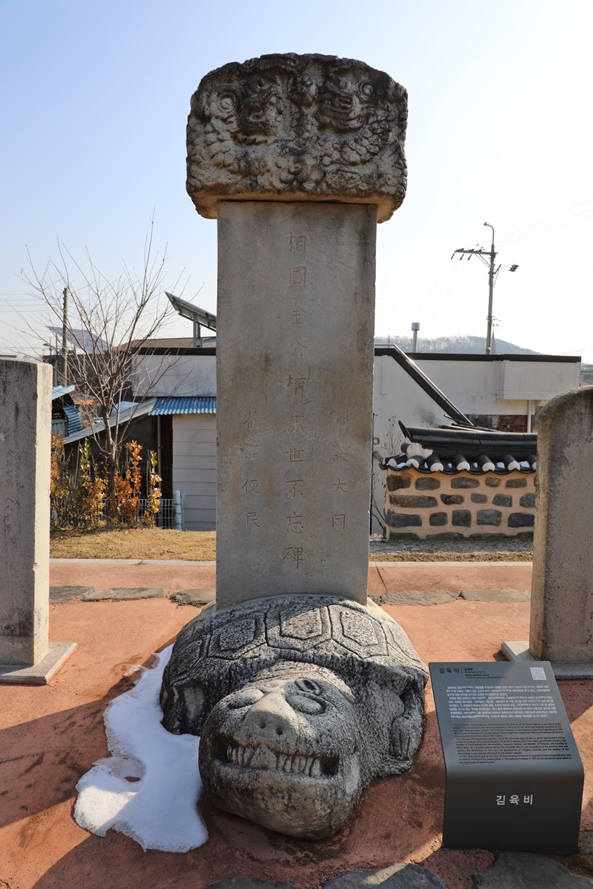 김육비는 김육(1580~1658)이 대동법을 주장하여 시행한 것을 기리기 위하여 세운 비이다. 비문에 '순치順治 17년' 17년'이라는 기록으로 보아 1660년 조선 현종 원년에 세워졌음을 알 수 있다. 신창초등학교 입구에 있던 비석을 2019년 신창현 역사공원으로 옮겼다.