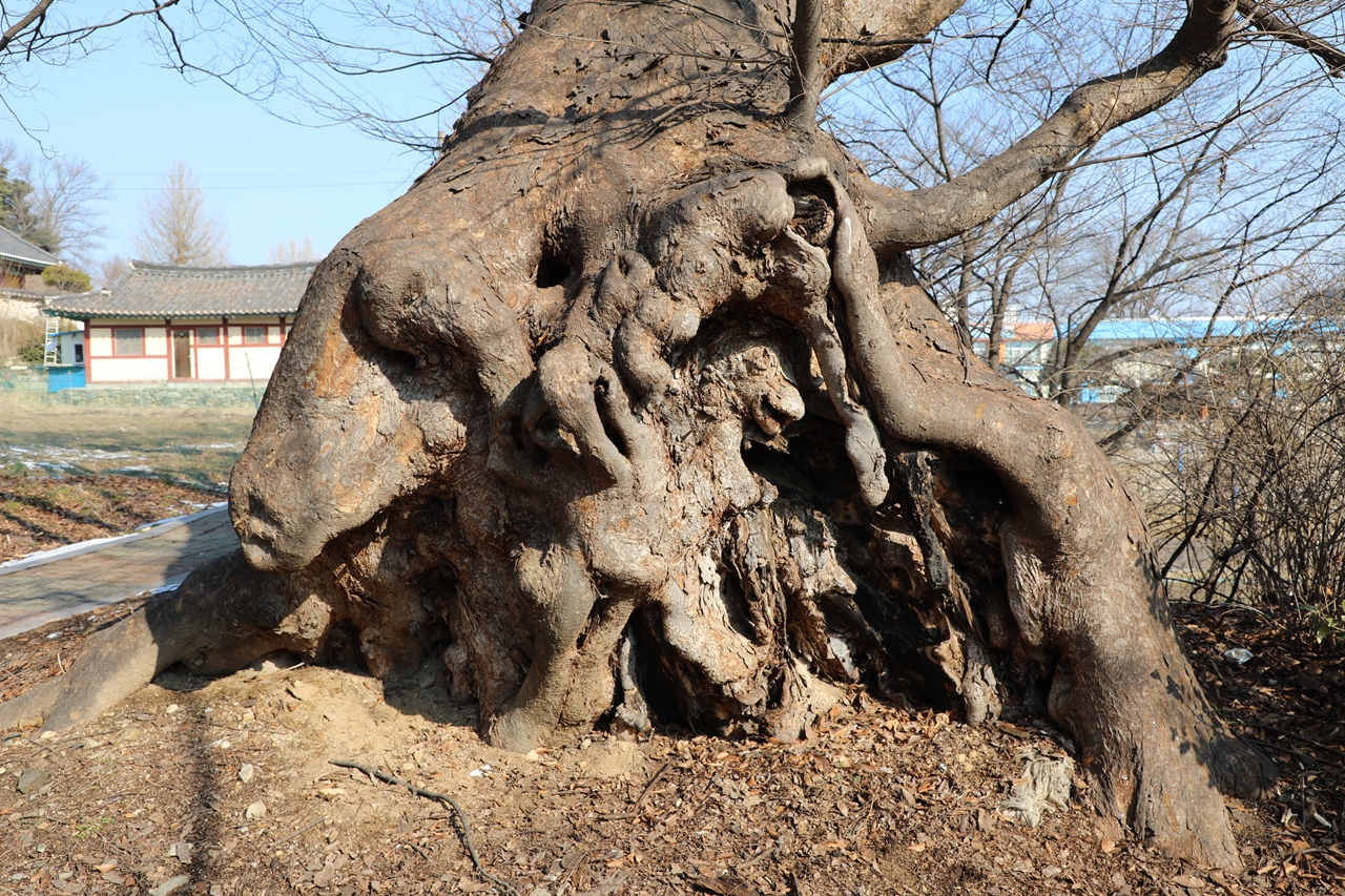 거대한 느티나무가 태풍에 45도 각도로 쓰러졌으나 비스듬히 누운 무게를 다 감당하며 끈질기게 살아간다.