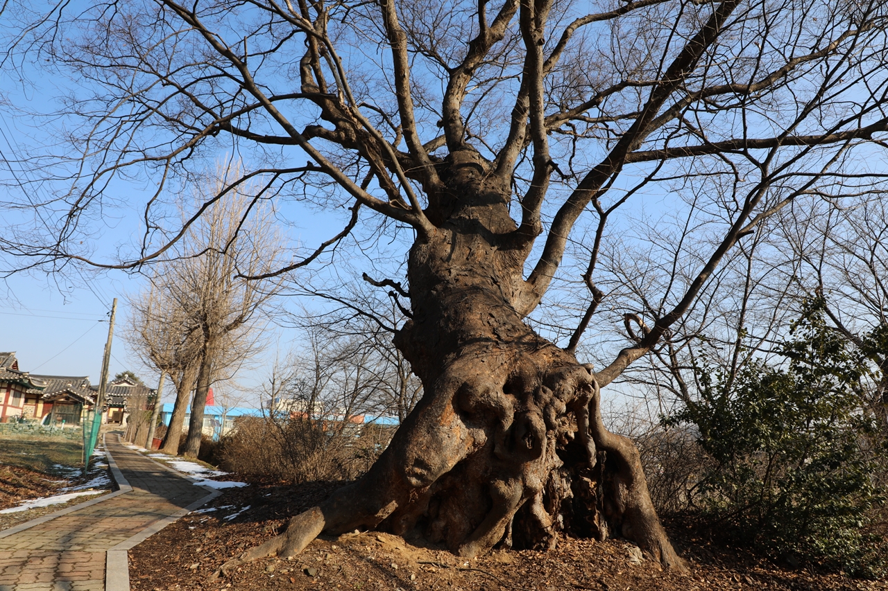 45도 각도로 누운 느티나무는 작은 가지가 모두 본줄기를 대신해 하늘로 뻗고 있다.